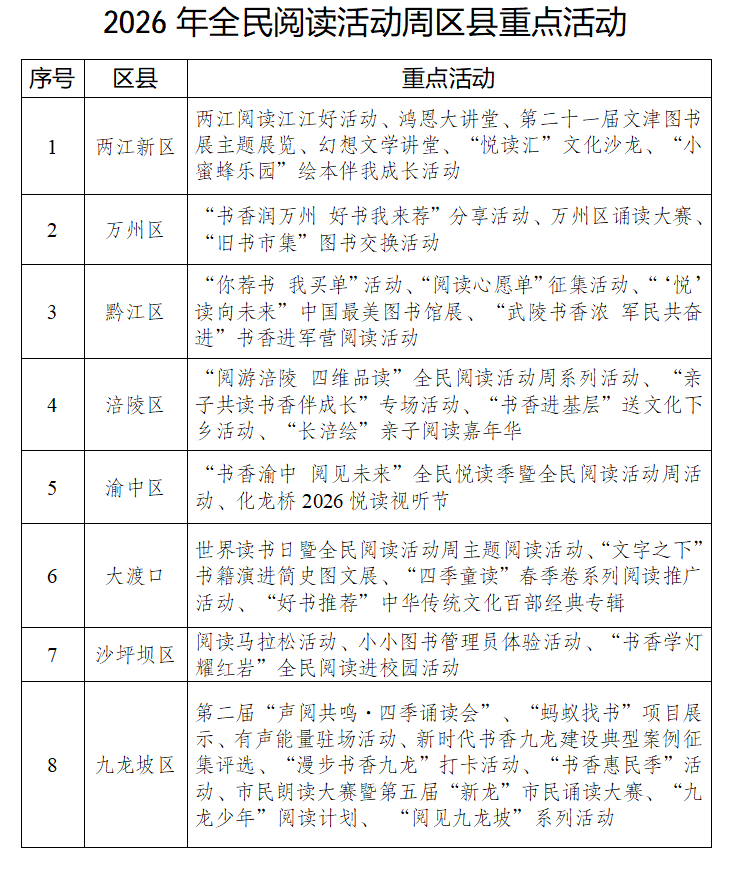 4月25日,将在两江新区钻石广场举办2026“书香重庆”全民阅读盛典,届时会发布全民阅读精品案例和城市阅读出版品牌。