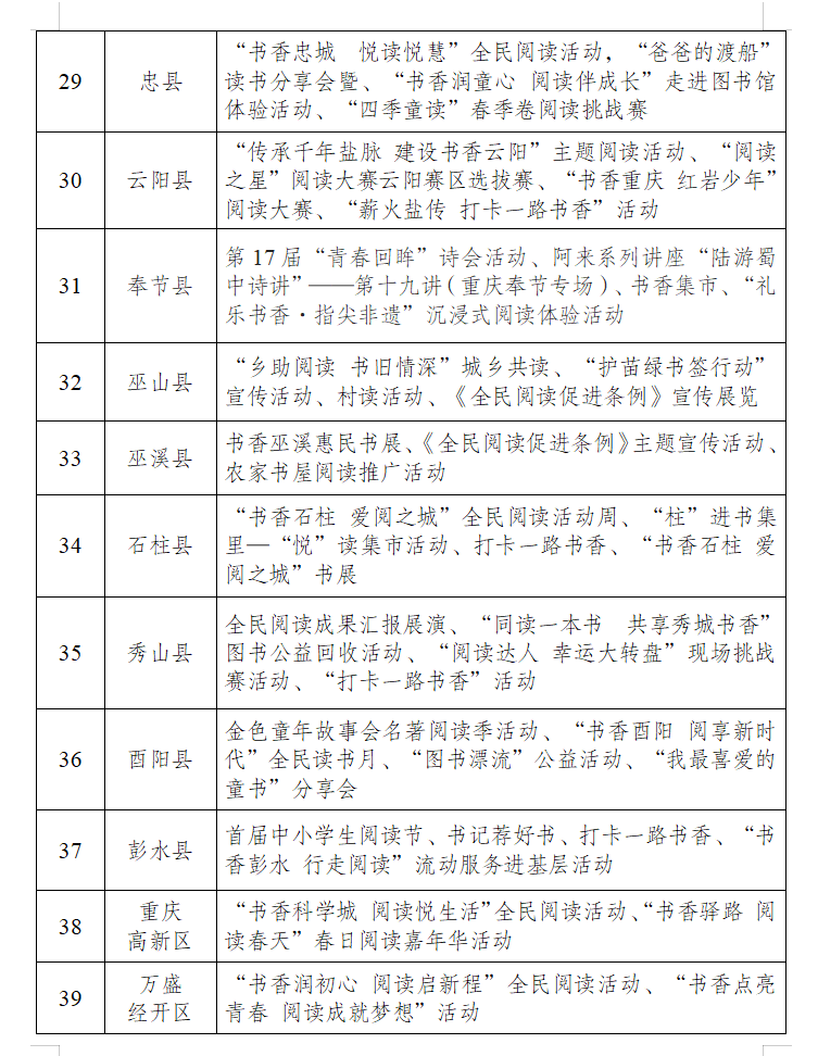 三是推行终身阅读计划。主要依靠相关行业系统、相关市级部门来推行一系列精准服务到分众化人群的全民阅读活动,比如,目前市委宣传部已经联合相关部门推出了驻场阅读空间计划、乡助公益阅读计划、红岩先锋月读计划、职工之家阅读计划、“青春年少好读书”计划等等。同时,也会加大对《全民阅读促进条例》的解读,开展全民阅读生态调查评估,为全民阅读提供法治保障和数据支撑。