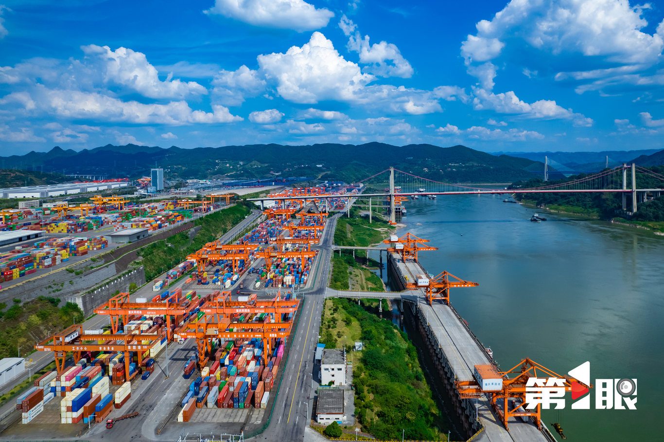 长江经济带的发展格局为一轴、两翼、三极、多点,长江黄金水道就是“一轴”,推动经济从沿海溯江而上、纵深发展,而内河航道衔接多式联运通道,则是广度的扩展。高耸的大型桥吊延伸至长江江面上,坐在港区中控室的工作人员只需轻点鼠标,便可从停靠在岸边的货轮上精准抓取集装箱,再通过往来穿梭的卡车运往相应堆场。在远处的作业区,各色集装箱堆垛成“山”,多台可远程控制的龙门吊轻巧抓取集装箱,平移至大型集卡上。这样的场景,每天都在重庆上演。