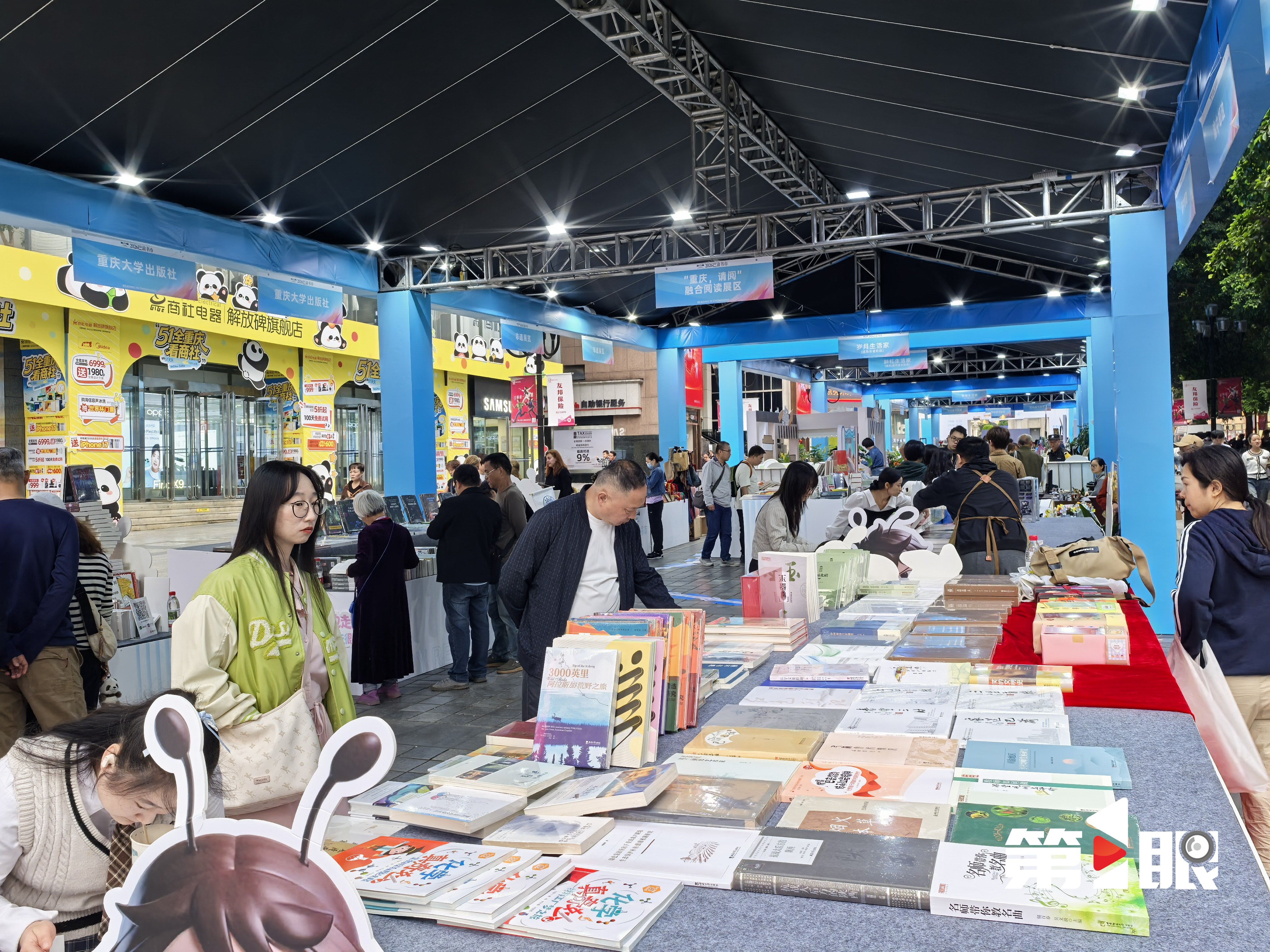 “大生活家”展区位于解放碑民族路,以“一步一龄”场景化布局,分设“奇想生活家”“斜杠生活家”“岁月生活家”三大体验区,从少儿到青年再到成熟长者群体,提供专属阅读体验空间。在书市现场,不少市民正沉浸式逛展。