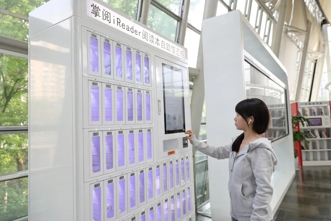 ▲读者正在重庆图书馆内借阅iReader电子书阅读器。受访单位供图