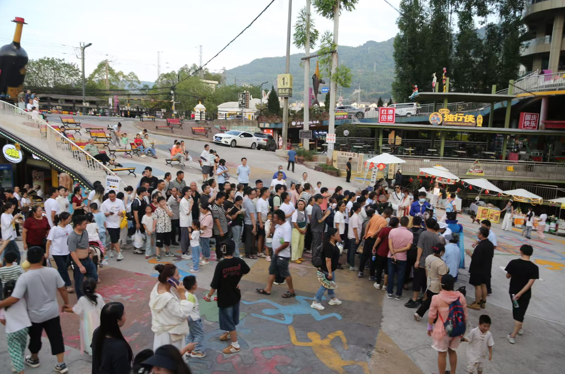 10月5日,重庆涪陵美心红酒小镇景区内人山人海,一场以“传统美食+涪陵特色产业”为主题的“庆国庆、迎中秋”活动火热进行。景区通过创新美食体验,深度融合涪陵榨菜、黑猪、红酒三大地理风味产业,为游客呈现了一场集味觉、视觉、文化于一体的沉浸式旅游新体验。
