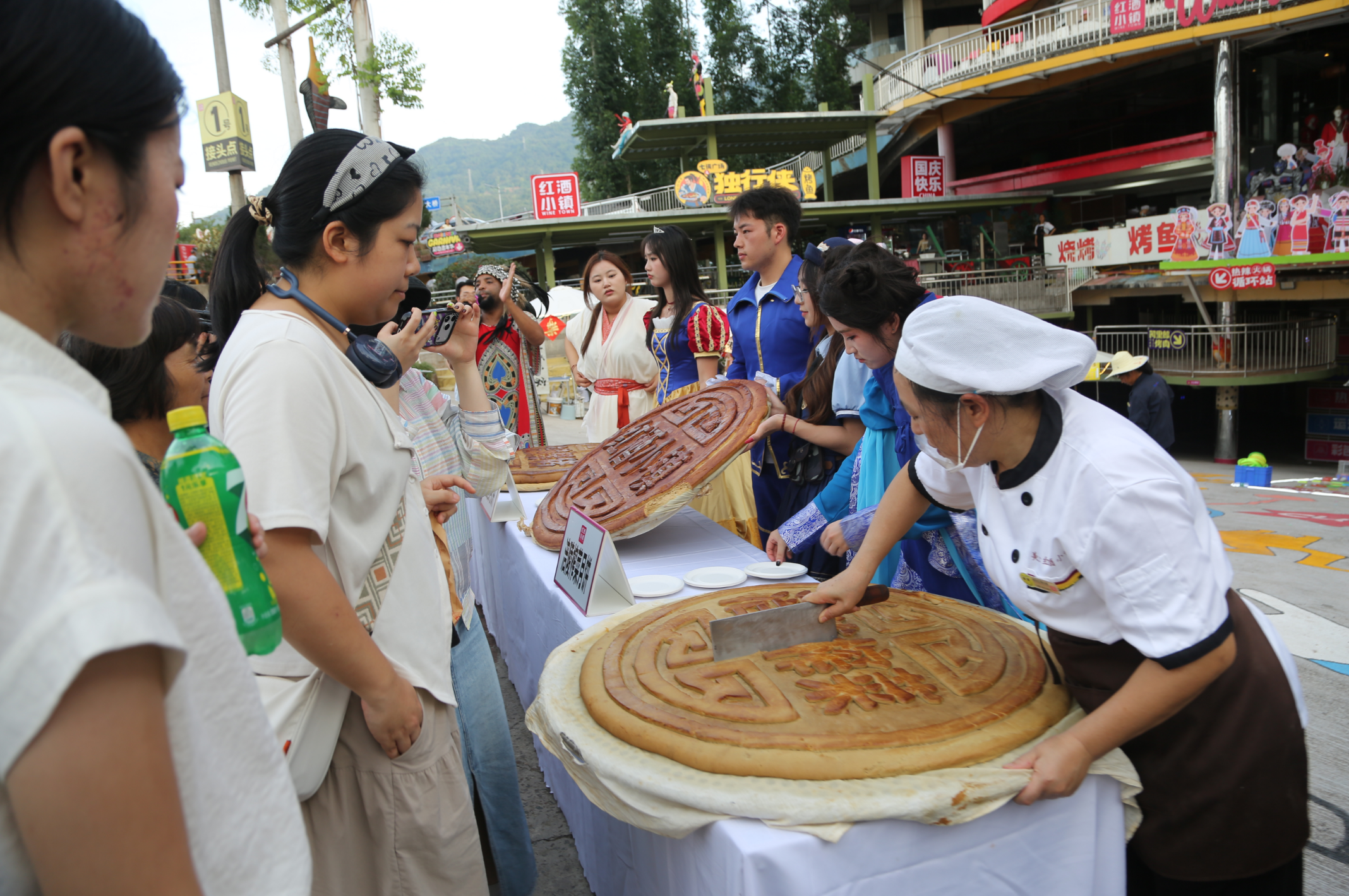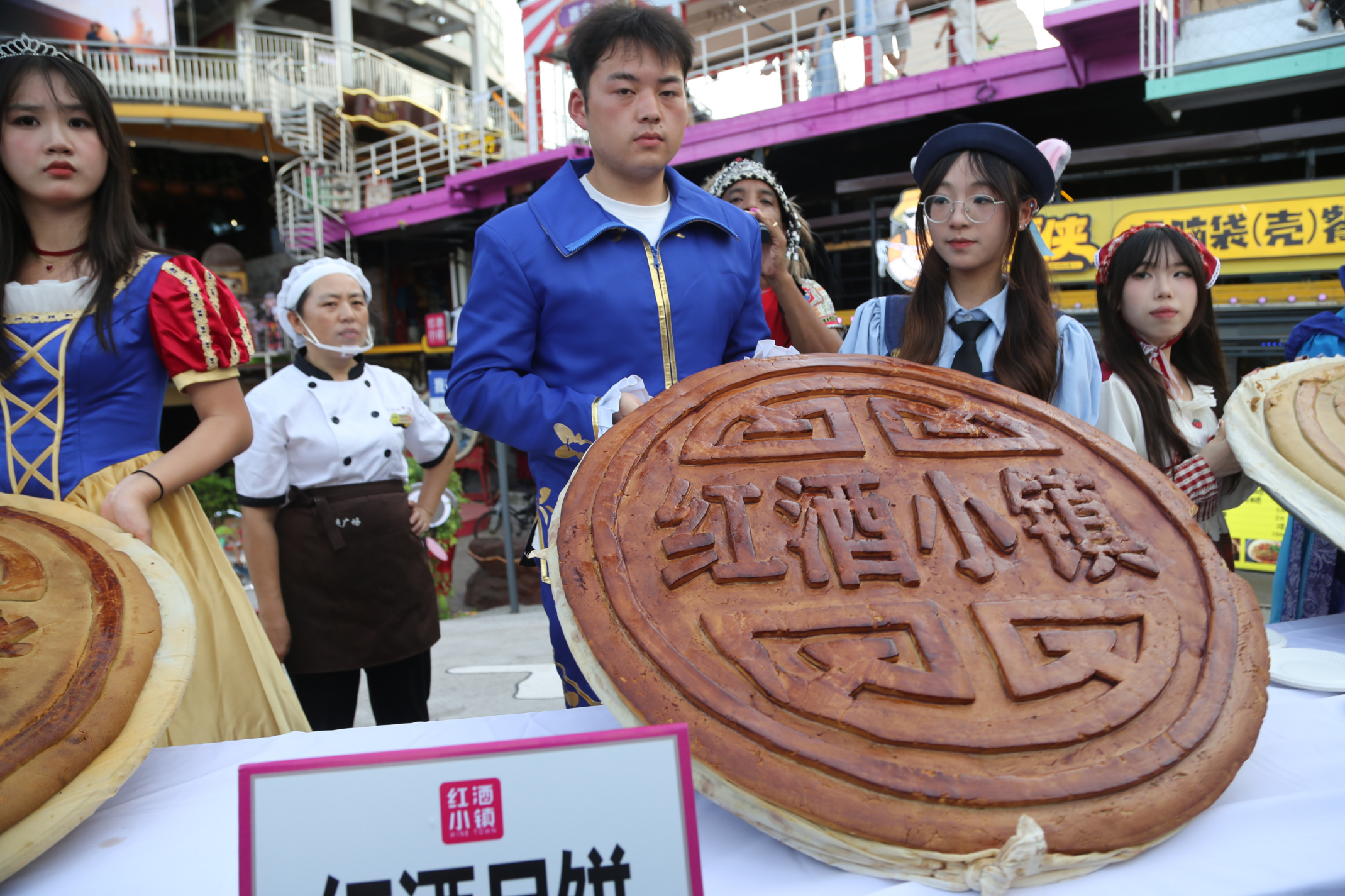 当日下午,美心红酒小镇景区的七侠广场已排起长队,三个直径1.5米的巨无霸“三宝月饼”惊艳亮相,红酒的醇香、榨菜的咸鲜、黑猪肉的浓香交织成独特风味,吸引众多游客排队免费品尝。“红酒月饼入口有单宁的回甘,榨菜月饼咸甜交织口感特别,黑猪肉馅的肉香十足!”游客邹女士连尝三块后赞不绝口。