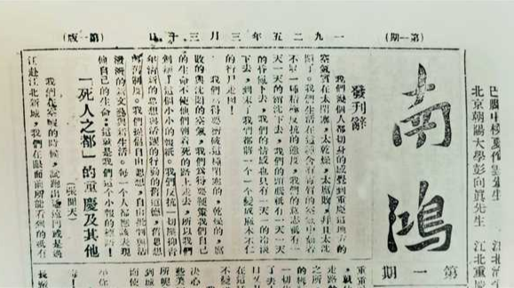 6月3日,西南政法大学教授蔡斐告诉记者,张闻天当时写下的这段文字就是他在重庆创办的《南鸿》周刊的发刊词。作为张闻天参与创办的第一本政治刊物,《南鸿》周刊虽然只存在了两个多月,但凭借犀利的文风,犹如闪电般划破了当时重庆沉闷的天空,为当时重庆乃至全国的知识青年带来了光明和希望。
