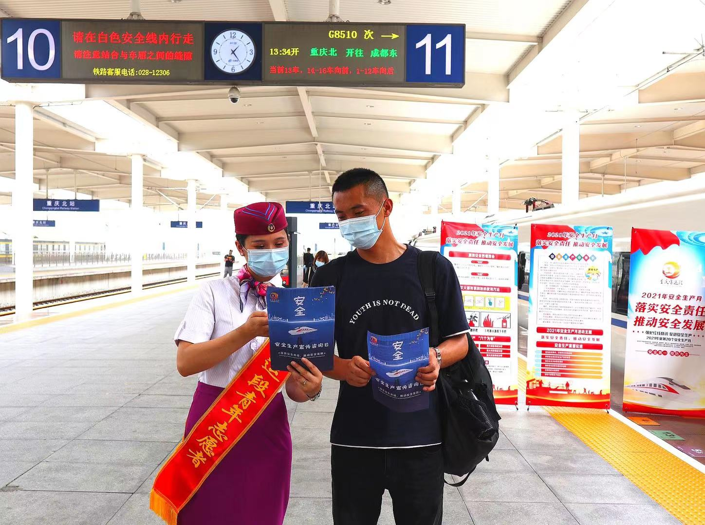 6月15日,重庆客运段联合重铁公安处,在我市各火车站、高铁列车上开展安全生产月宣传咨询日活动,通过“列车安全微课堂”进车站活动,提升广大旅客的安全意识,营造全社会参与安全生产及爱路护路的良好氛围。