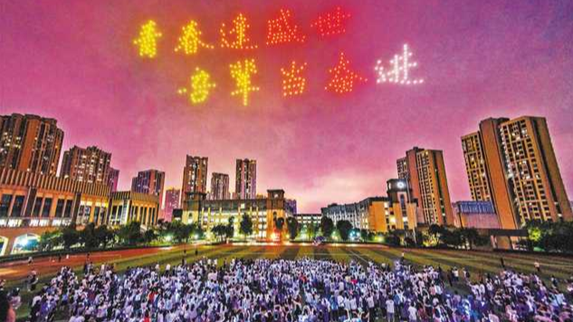 6月9日,杨家坪中学彩云湖校区考点,当日高考结束后的毕业典礼中,一场编队灯光秀绚丽上演,365架无人机在夜空中点亮了校园。