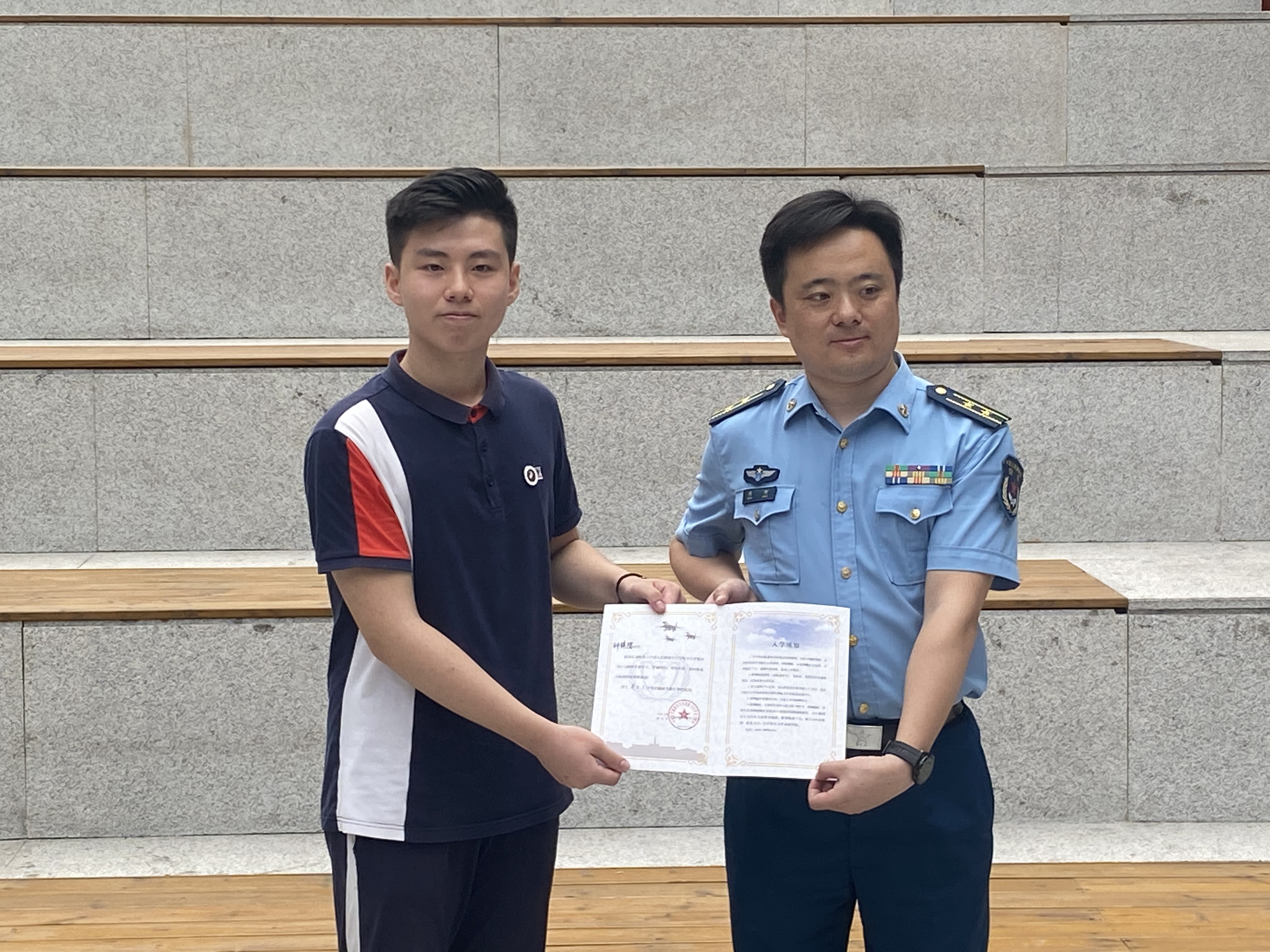 7月12日上午,重庆市第一中学校的钟镇陽同学收到了重庆市2021年第一封普招录取通知书,他以普通类(物理)656分成绩,被空军航空大学航空飞行与指挥专业录取。