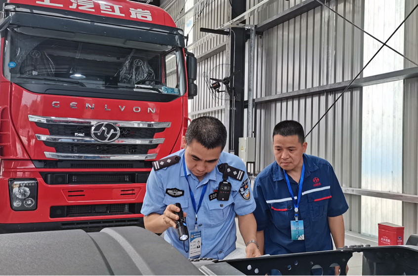 7月7日上午,重庆巨邦通流运输有限公司员工罗礼祥和另外两名同事一道,驾驶着三辆全新的上汽红岩重型工程卡车驶入了金山车驾管社会服务站,为车辆上户。称重、测量外廓尺寸、检验机车指标……三台车辆在检测站驻站民警的细致操作下,很快完成了检测。