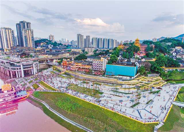 6月29日,沙坪坝区嘉陵江畔的千年古镇磁器口喜事连连:磁器口步行街开街、磁器口后街开业、磁器口码头开放、磁器口夜景灯饰开灯、重庆1949大剧院开演、沙滨路开通、磁器口外街开工……