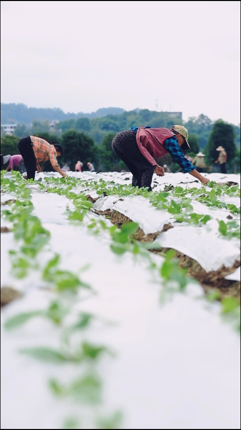 清晨,菜苗在微风中轻轻摇曳。农人俯身劳作,盖膜、引苗,指尖流淌着对丰收的希冀。