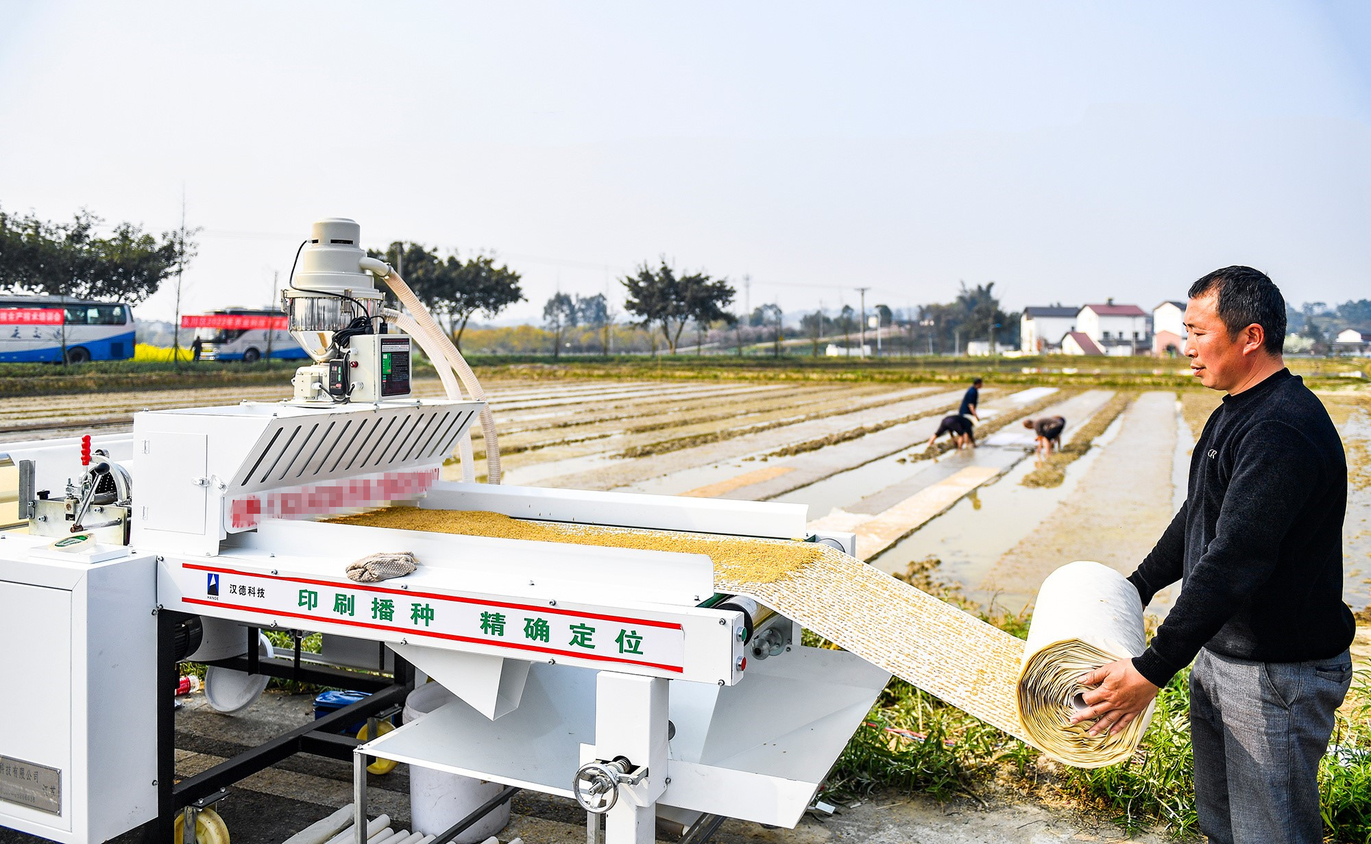 3月10日,重庆市永川区五间镇新建村基质育秧技术示范点,在农技专家指导下,村民正使用印刷播种技术进行水稻播种。