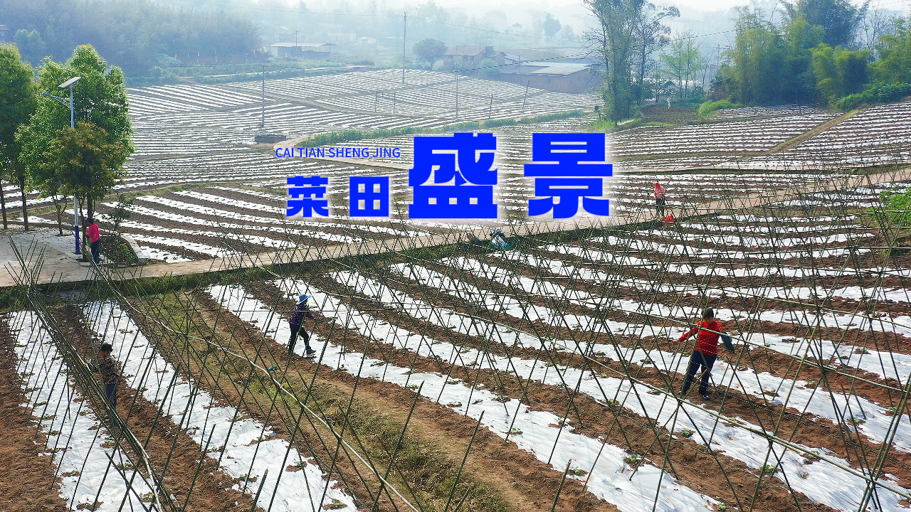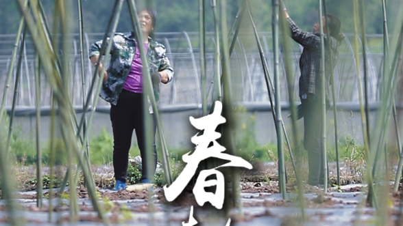 春日菜田生机勃勃,菜农挥汗搭架引蔓,绘就田园劳作盛景。