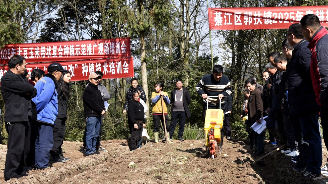 当前正值春耕生产的黄金期。3月20日,綦江区郭扶镇举行2025年大豆玉米带状复合种植示范推广现场培训会,为村干部、种植大户直观展示大豆玉米带状复合种植技术要领,提升规范化标准化种植水平。