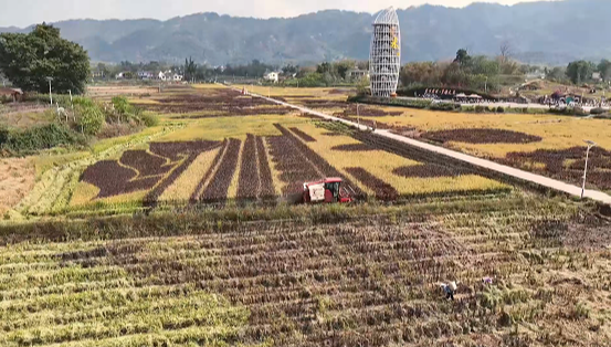 金秋十月,位于重庆市大足区拾万镇长虹村的隆平五彩田园迎来秋收季。远远望去,五彩斑斓的稻田犹如一幅巨大的画卷,稻穗在阳光下闪耀着光芒。不同颜色的稻子交织在一起,构成了各种美丽的图案和文字,展现出农民们的智慧和创造力。
