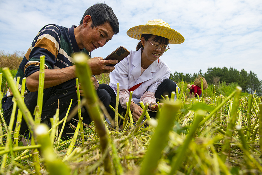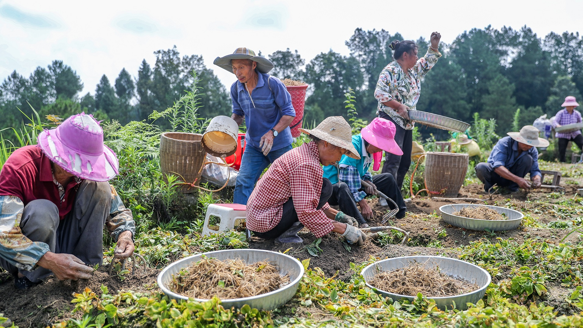 7月2日,忠县永丰镇东方村产业基地里,村民们集中采挖太子参,现场一片繁忙景象。