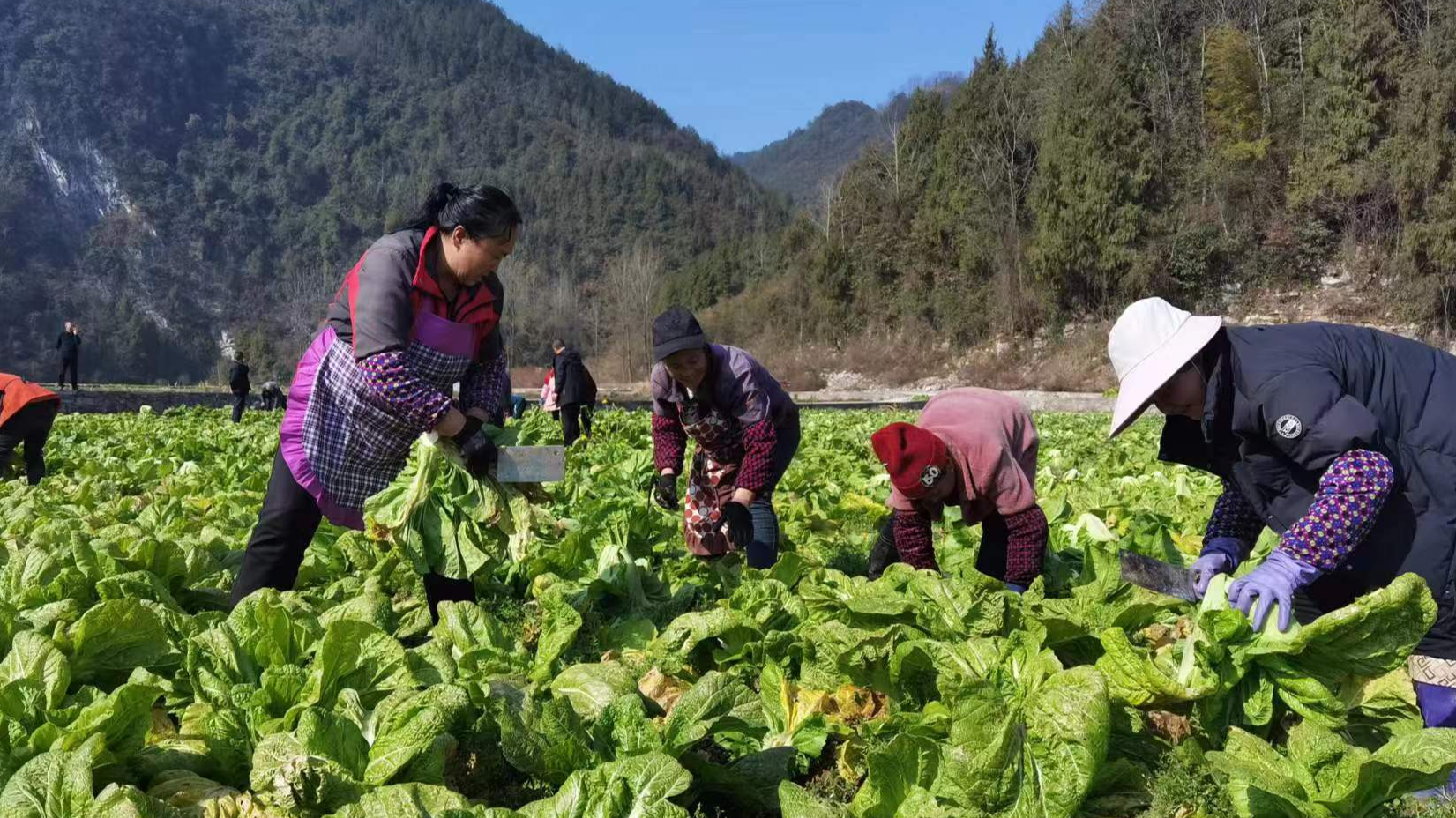 2月18日,在酉阳县苍岭镇太河村一片芥菜基地里,绿油油的芥菜长势喜人,村民们正在收割芥菜,田间地头一派丰收景象。
