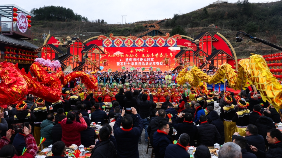 瑞兔辞旧岁,辰龙报新春。2月2日,桥头镇陶然居瓦屋小镇彩灯高挂、锣鼓喧天,“大地欢歌迎新春·五谷丰登庆丰年”2024重庆市乡村“村晚”大联欢暨石柱县龙年春节团拜会活动激情上演,全县干部群众欢聚一堂,热热闹闹迎新春。