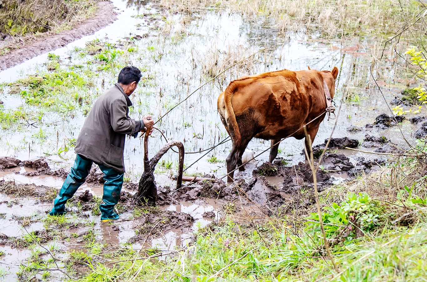 3月3日,忠县马灌镇金宝村一组,村民在整理水田,为下一步培育秧苗做准备。