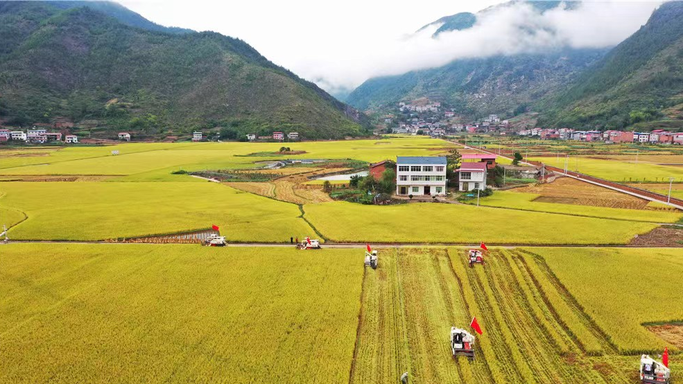 9月6日,在重庆涪陵的坪上粮仓——龙潭镇,这里的稻田金黄、稻穗低垂、稻谷飘香……近年来,涪陵夯实粮食安全根基,全力推进“藏粮于技”,大力推行机械化、智能化农机技术,不断提升粮食产量和质量。目前,全区50万亩水稻全面开镰收割,1100台各类联合收割机已开进田间地头,预计在9月中旬全部完成,让水稻颗粒归仓。