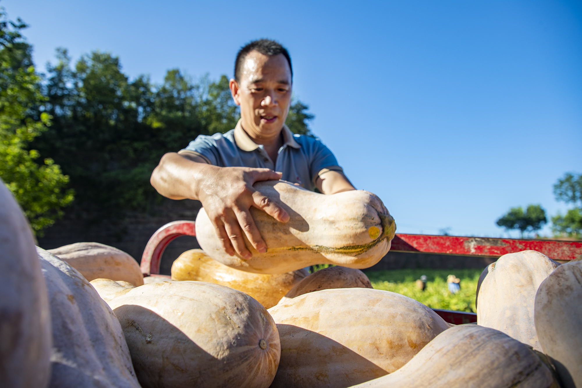 8月14日,拔山镇汪家洞村集体经济产业基地里,村民们忙着收获南瓜,脸上溢满汗水和笑容。