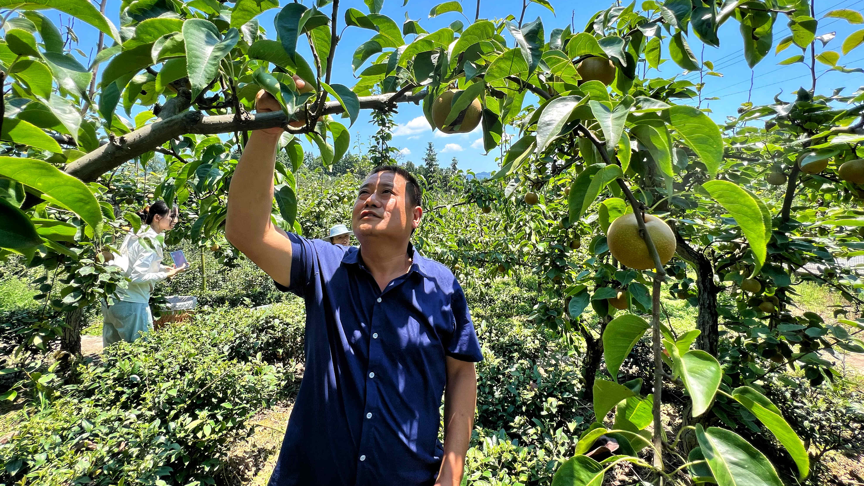 7月17日下午,炎热的天气抵挡不住綦江区永新镇石坪村种植大户幸定华丰收的喜悦,他背上背篓来到种植地里采摘梨子。