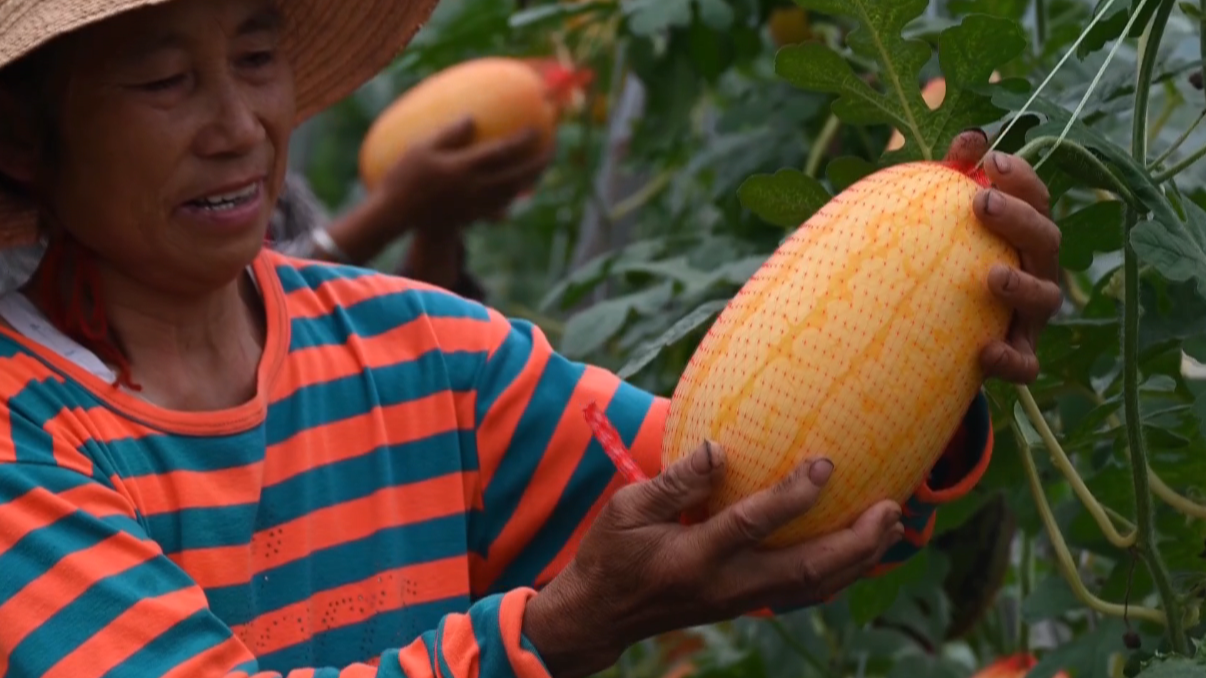 万州:西瓜穿上“黄马甲 ” 金光闪闪空中挂