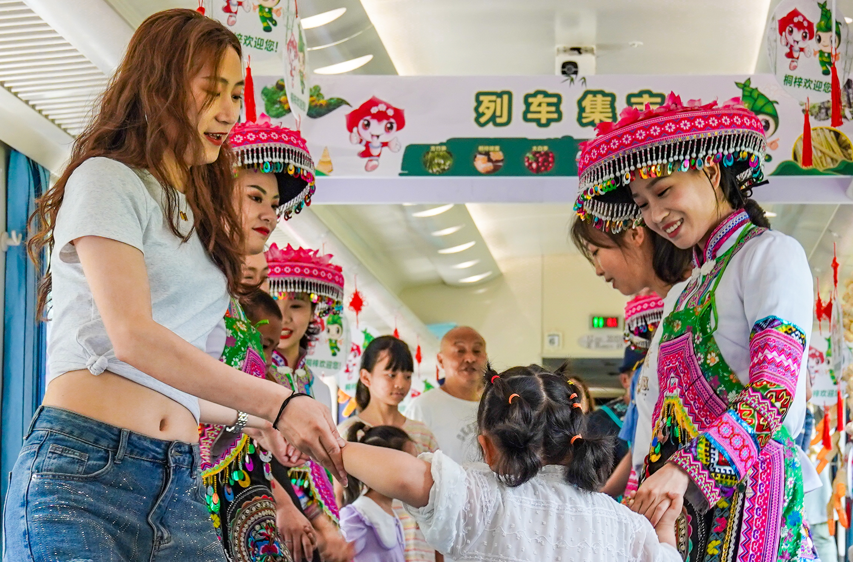 暑运期间,成渝贵地区铁路客流持续增长,乘坐“小慢车”前往贵州地区避暑游玩的市民及外地游客逐日增加。中国铁路成都局集团有限公司、桐梓县文化旅游局联合在“川黔小慢车”上,创新推出旅游新产品、新花样,吸引着更多游客慕名而来,带动了沿线旅游目的地消费火热。
