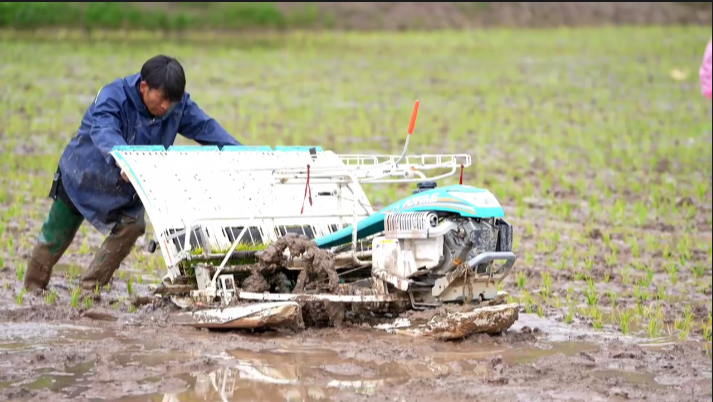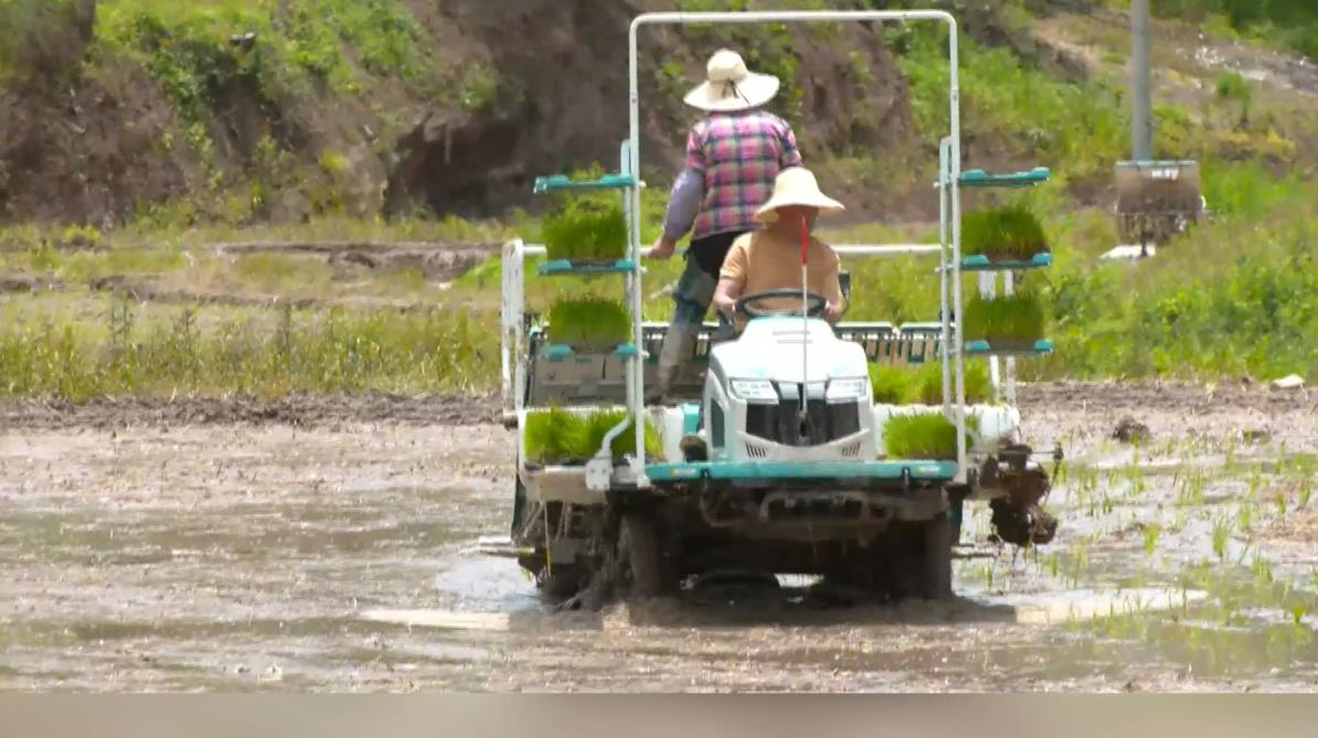 石柱县桥头镇,水稻种植实现机械化,插秧机助农生产。
