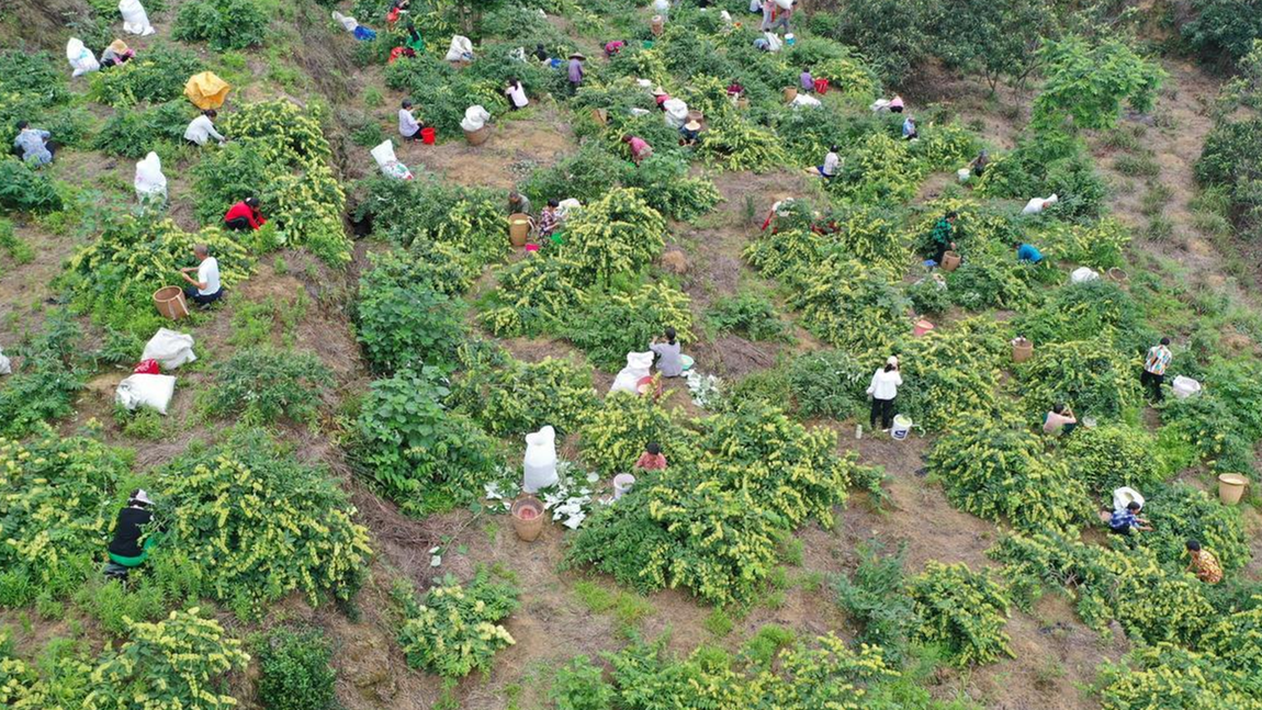 6月13日,在綦江区三角镇望石村,成片的花椒树散发着浓浓的花椒香味,颗粒饱满的青花椒压弯了枝头,数十名椒农正忙着采摘成熟的花椒。