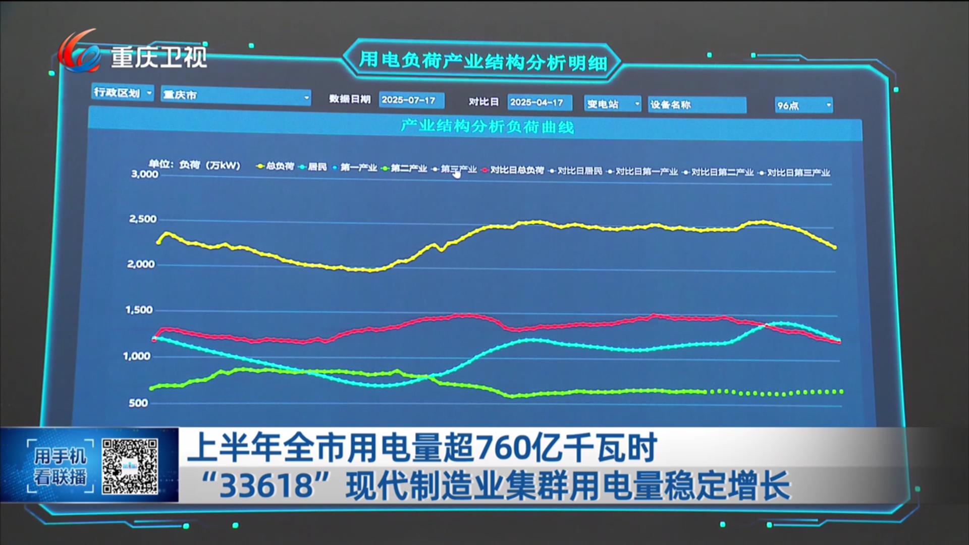 用电数据是经济发展的“晴雨表”。记者从国网重庆市电力公司了解到,今年1—6月,全市用电量超760亿千瓦时,同比增长6.2%。从产业细分来看,“33618”现代制造业集群用电量整体稳定增长。
