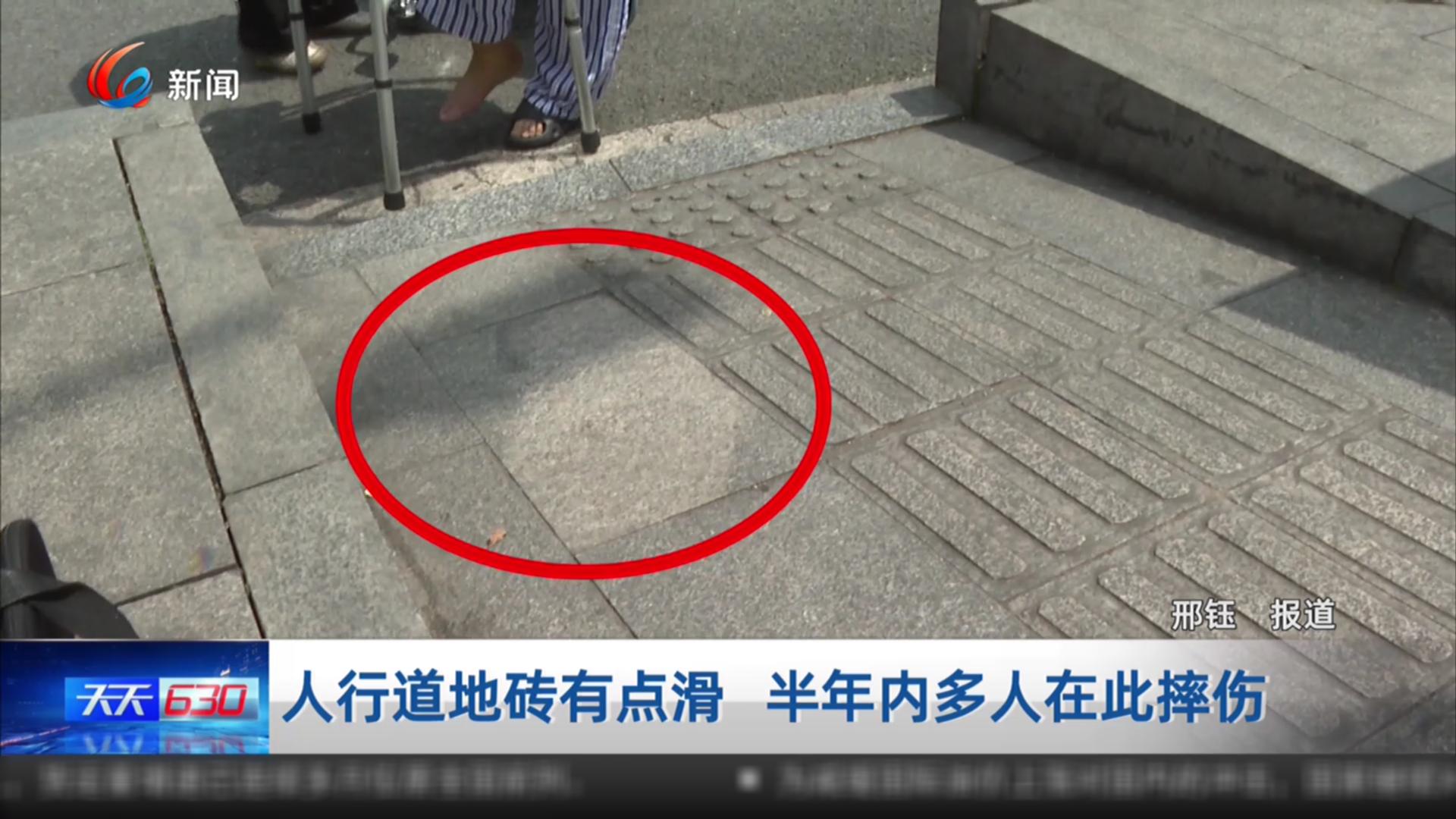 市民朱女士说,两江新区鲁能新城五街区车库外人行道的地板砖有点滑,最近已有多人在这里摔倒摔伤。前几天,朱女士经过此处时,甚至被摔成了骨折。