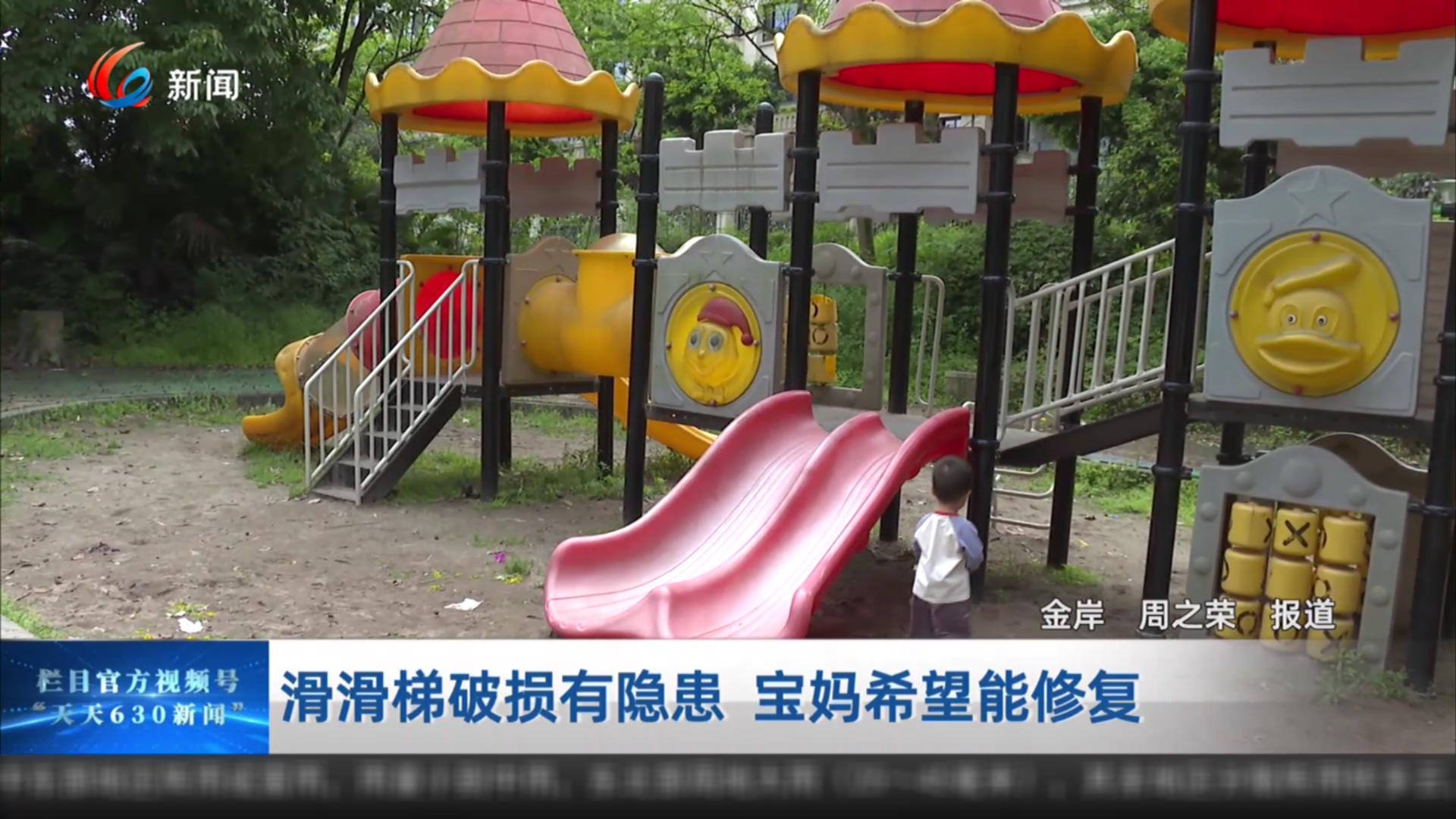 两江新区蔡家岗街道,金科城嘉陵江上小区旁,有一部滑滑梯,深受附近小朋友的喜爱。但最近有宝妈发现,因为年久失修,滑滑梯上的一些零件已经破损,容易给孩子造成伤害。