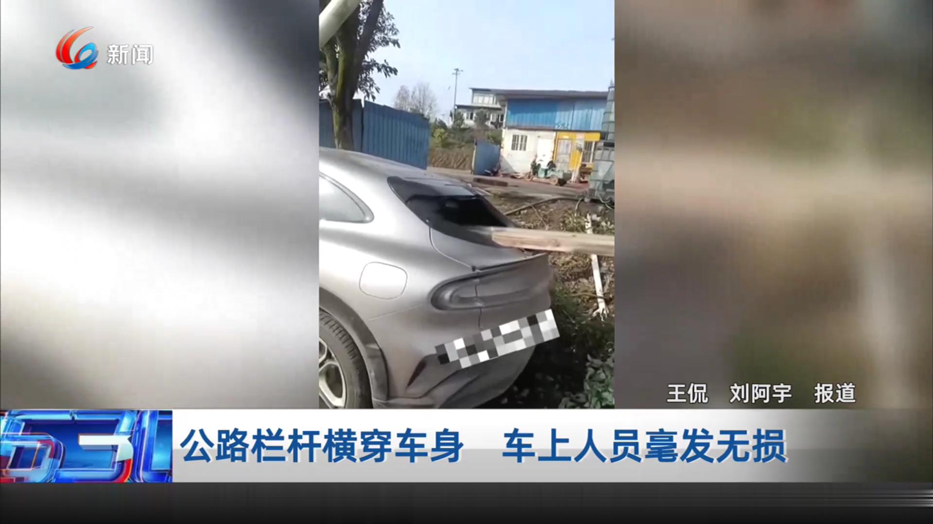 公路栏杆横穿车身 车上人员毫发无损