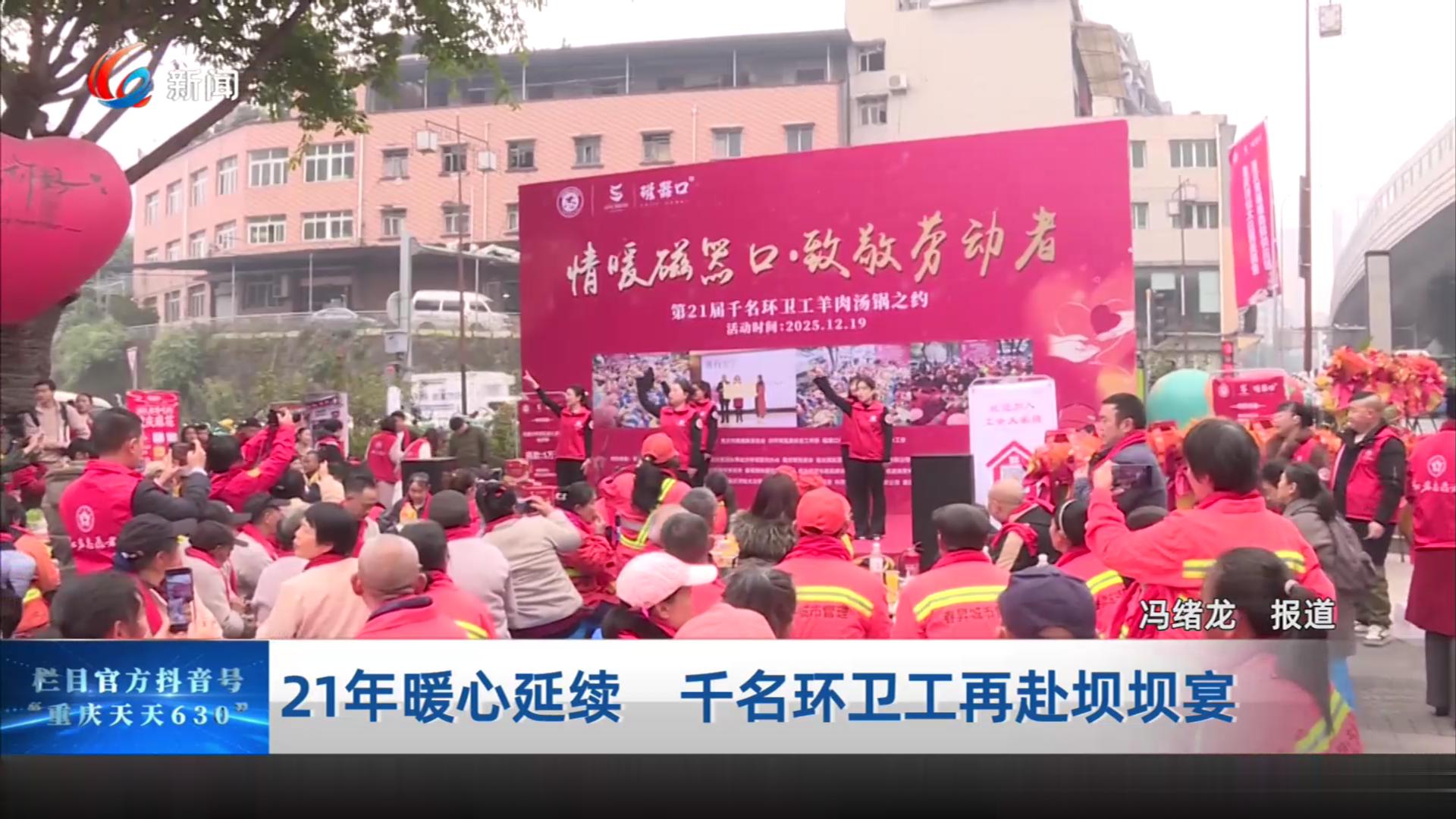 12月19日中午,磁器口地铁站广场摆起120多桌羊肉汤锅坝坝宴,一千多名环卫工人齐聚一堂,共享这场延续了21年的爱心盛宴。
