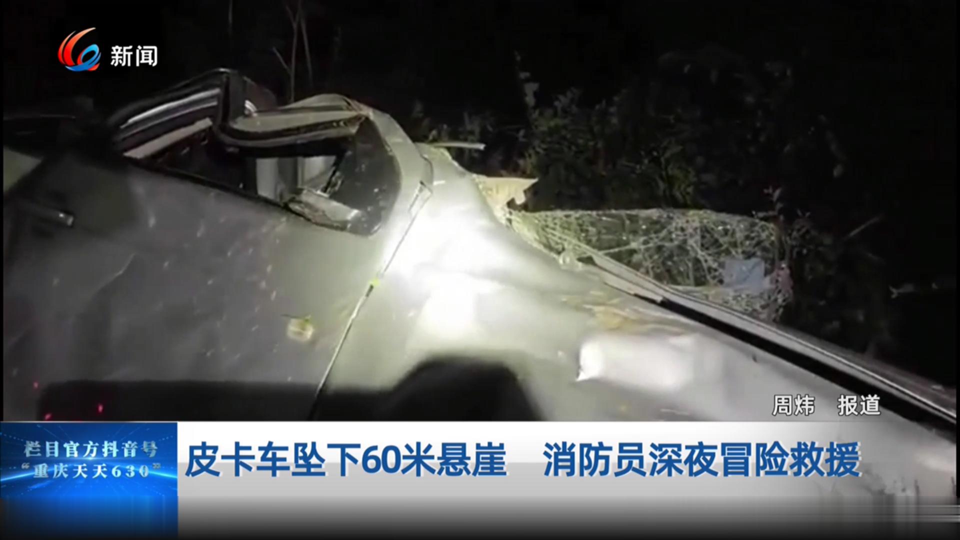 皮卡车坠下60米悬崖 消防员深夜冒险救援