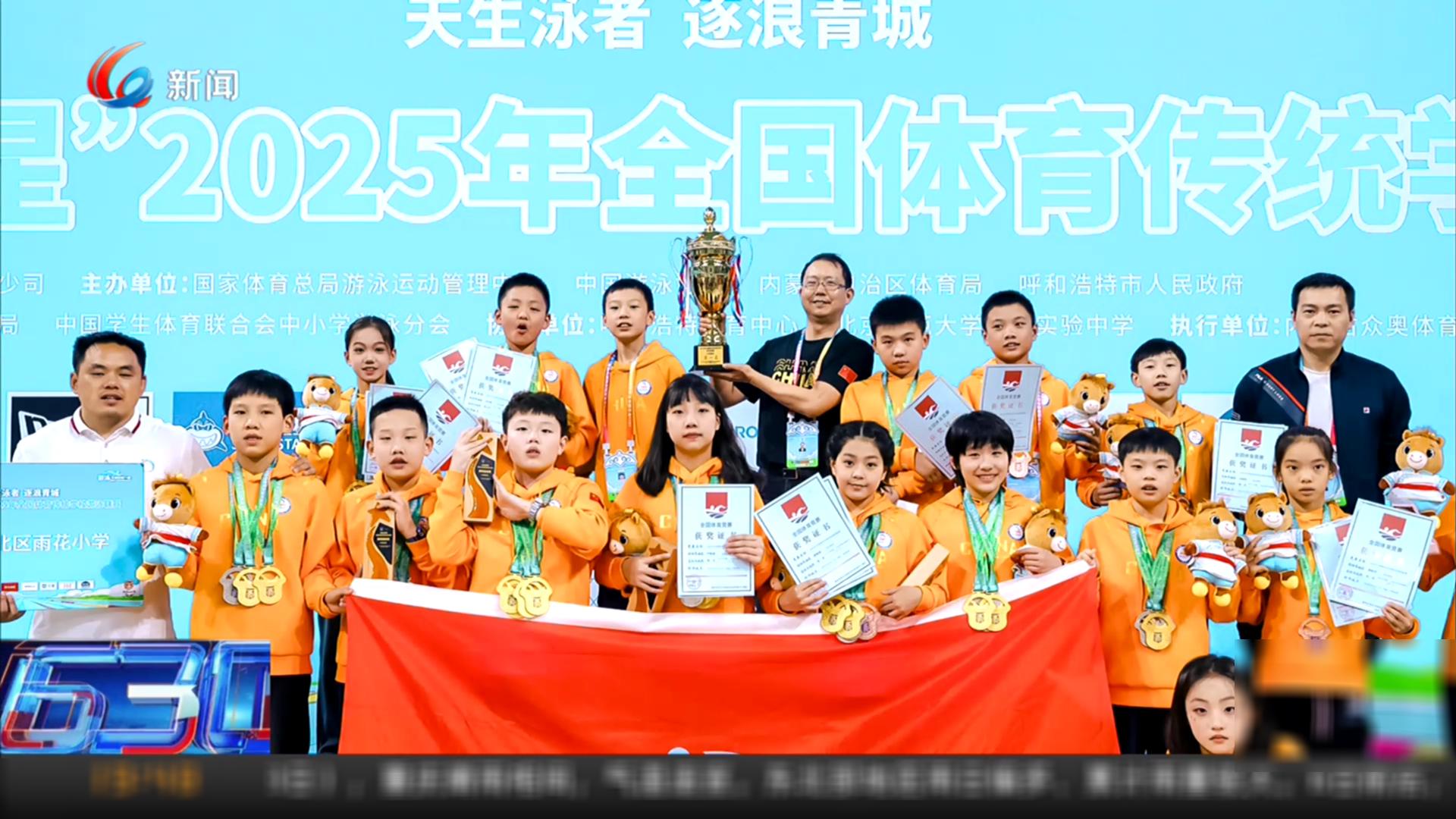 在2025年全国体育传统项目学校游泳联赛中,江北区雨花小学获小学组金牌榜榜首,小学组团体总分第一名,连续三年蝉联该赛事的小学组冠军。在全国众多强手之中,名不见经传的雨花小学,为何会脱颖而出呢?是选手现场超常发挥的灵光乍现,还是另有“秘诀”?我们一起来看。