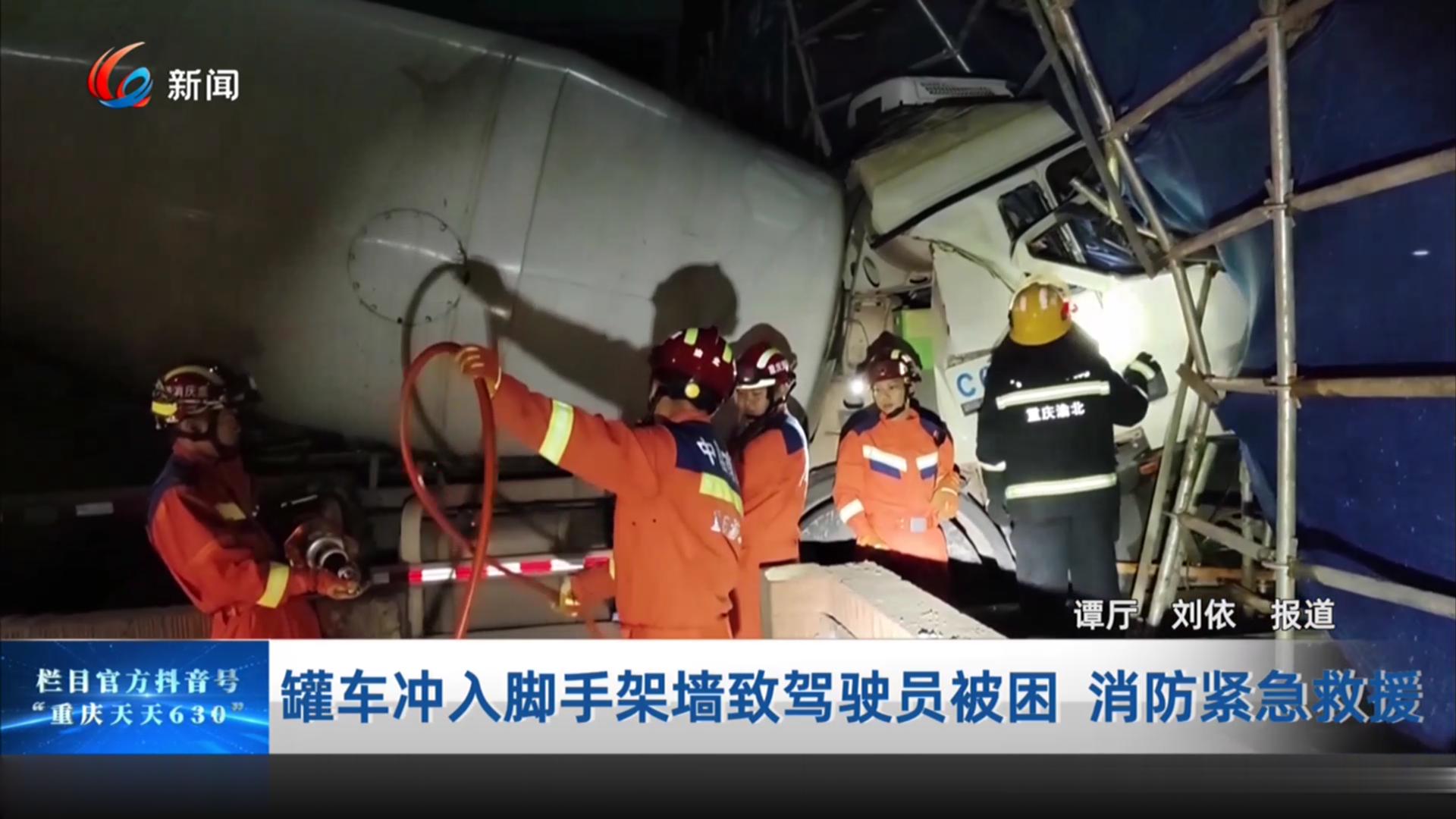 罐车冲入脚手架墙致驾驶员被困 消防紧急救援