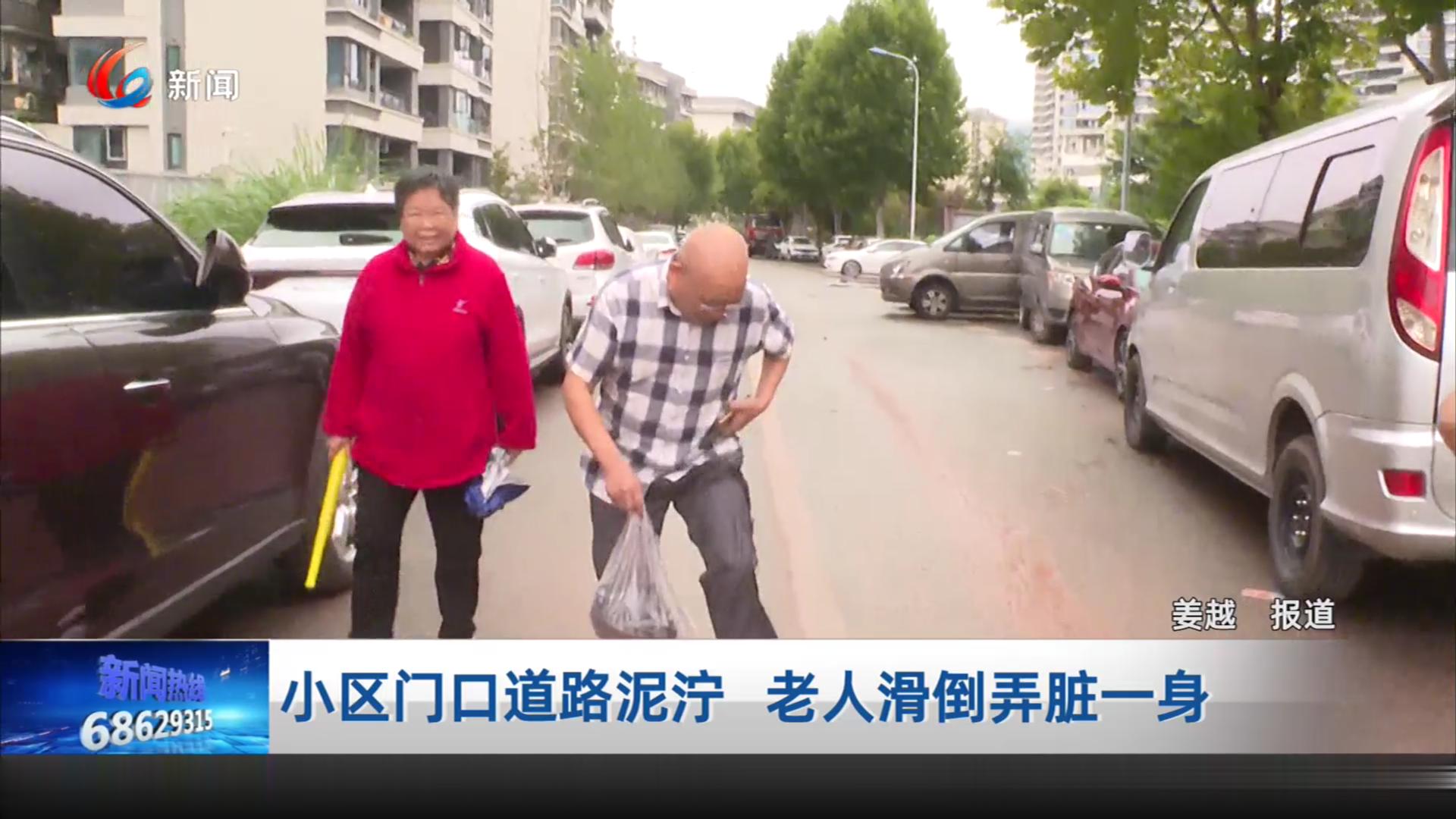 小区门口道路泥泞 老人滑倒弄脏一身