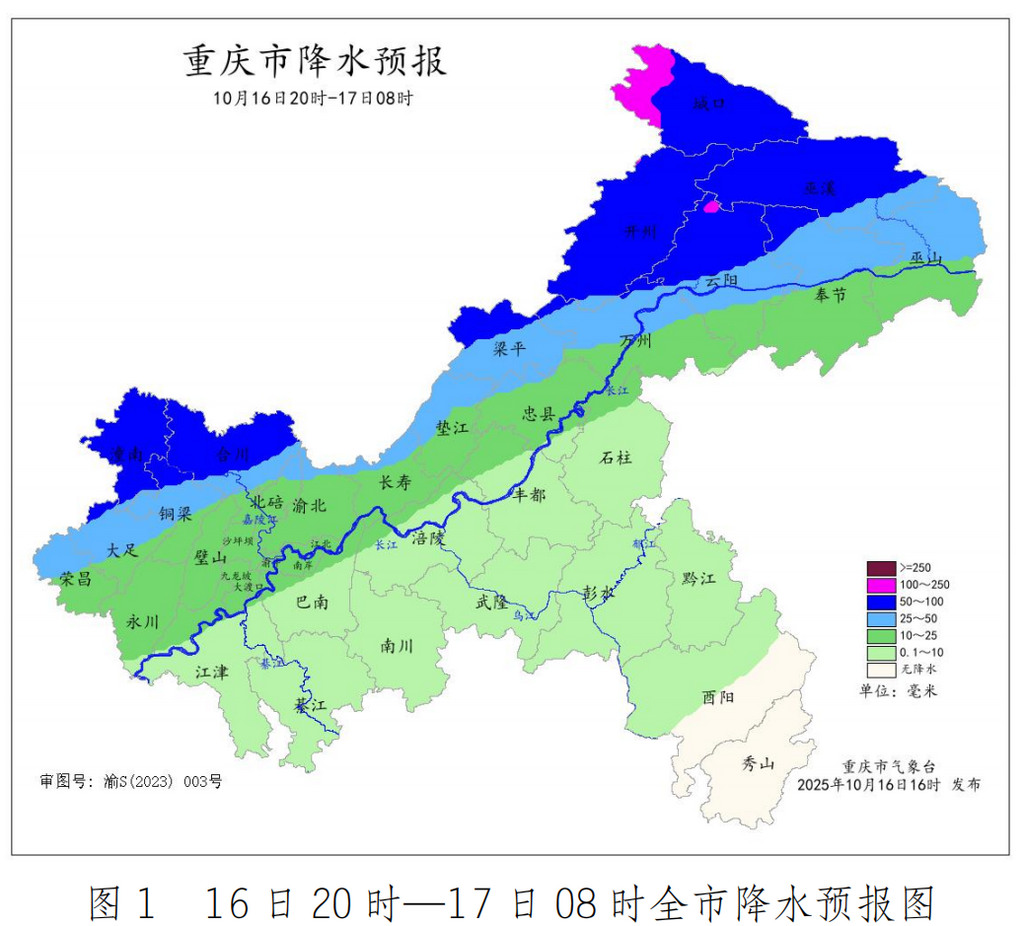 10月16日,重庆市气象台预计,未来三天重庆多降雨,其中16日夜间到17日夜间西部偏北和东部地区大到暴雨,局地大暴雨(累计雨量40~90毫米,局地120~150毫米)。东部地区累计雨量较大,叠加前期降雨影响,注意防范中小河流洪水、山洪、滑坡、泥石流、崩塌、城乡积涝等次生灾害。
