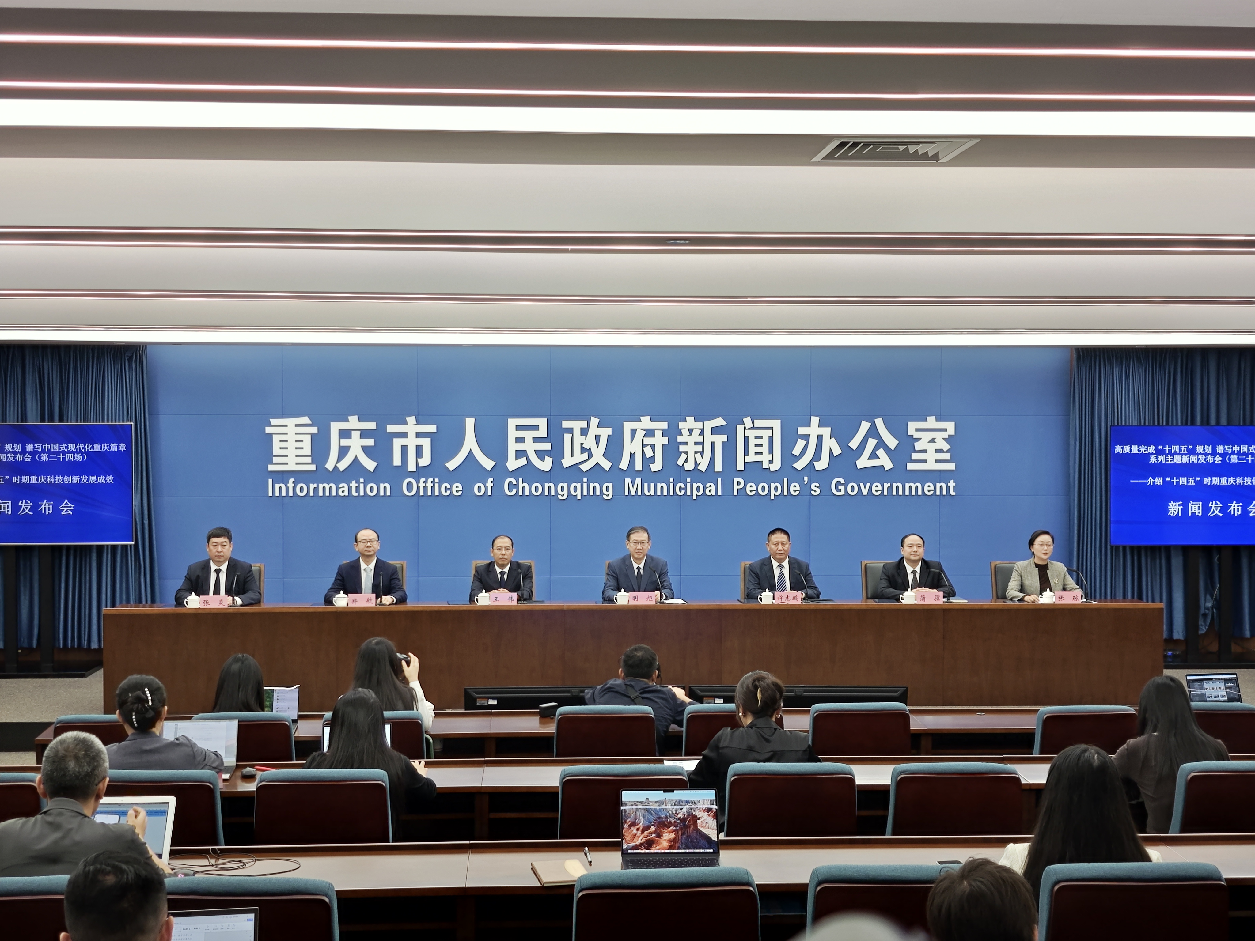 10月15日下午,重庆市政府新闻办举行“高质量完成‘十四五’规划 谱写中国式现代化重庆篇章”系列主题新闻发布会(第二十四场),本场发布会主题是介绍“十四五”时期重庆科技创新发展成效。会上,市科技局党委书记、局长明炬介绍,重庆市科技创新“十四五”规划目标任务全面落地,13项核心指标顺利完成,研发经费投入强度、万人发明专利拥有量等7个关键指标实现倍增,具有全国影响力的科技创新中心建设迈上新台阶。