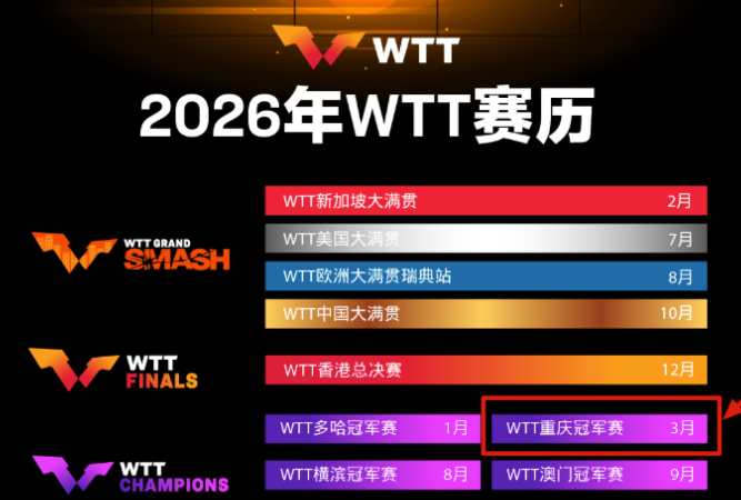 近日,@WTT世界乒联 发布了2026年WTT系列赛赛历。赛历中显示,WTT重庆冠军赛将在2026年3月举办。