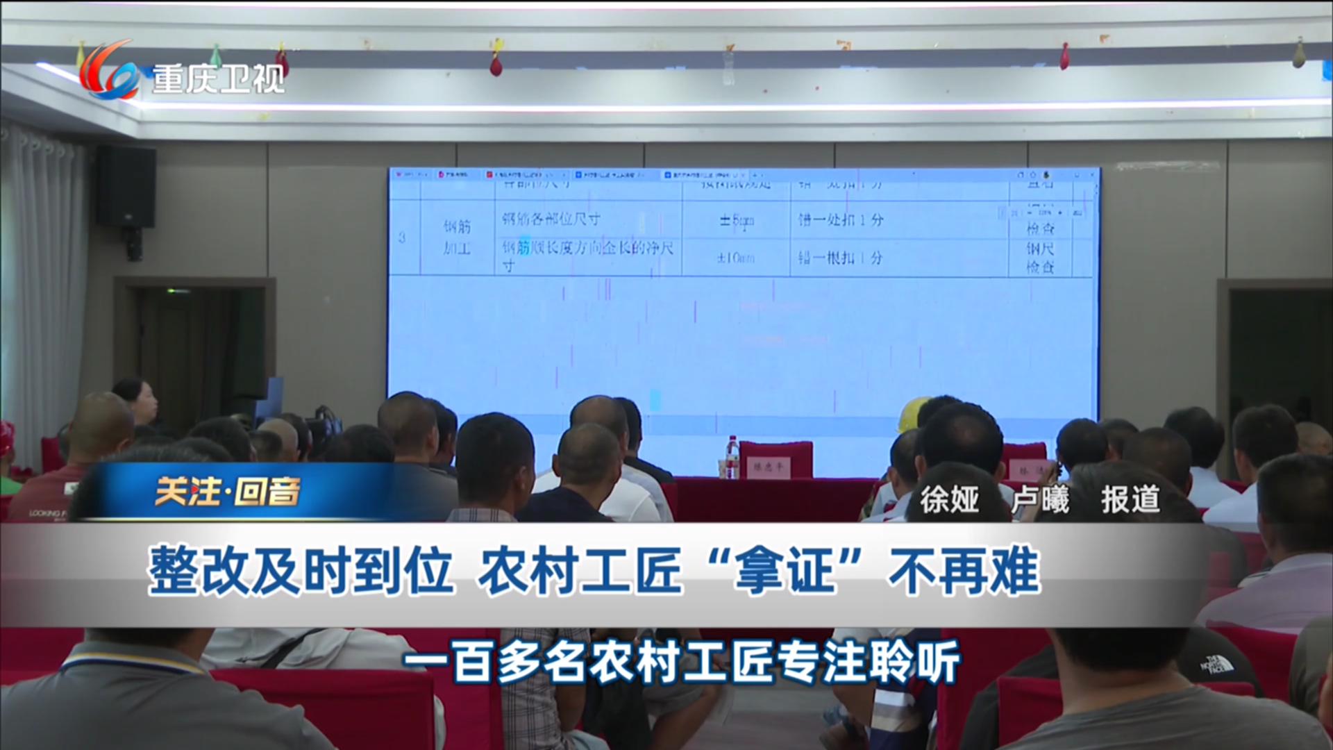 聚焦民生、化解矛盾,促进发展、助力执政,这里是《今日关注》。此前,我市部分区县要求农村工匠必须持有“工匠证”,才能承包农村建房项目;然而,实际情况却是当地长期没有开展工匠培训,工匠们“无处拿证”。前段时间,《今日关注》报道了部分区县农村工匠必须“持证上岗”,却又“无处拿证”的困境后,各级主管部门迅速行动、积极整改。一起来看《关注 · 回音》。