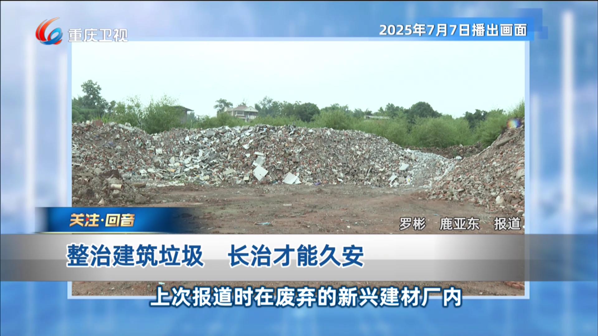 聚焦民生,化解矛盾,促进发展,助力执政。这里是《今日关注》。荣昌区昌州街道有两个黑渣场已经存在两年以上,渣车长期在这里倾倒建筑垃圾,却无人过问。7月7号,《今日关注》对此进行报道后,荣昌区高度重视,并于7月9号召开了建筑垃圾专项整治会议,迅速落实整改措施。那么,目前整改的效果如何呢?来看关注·回音。