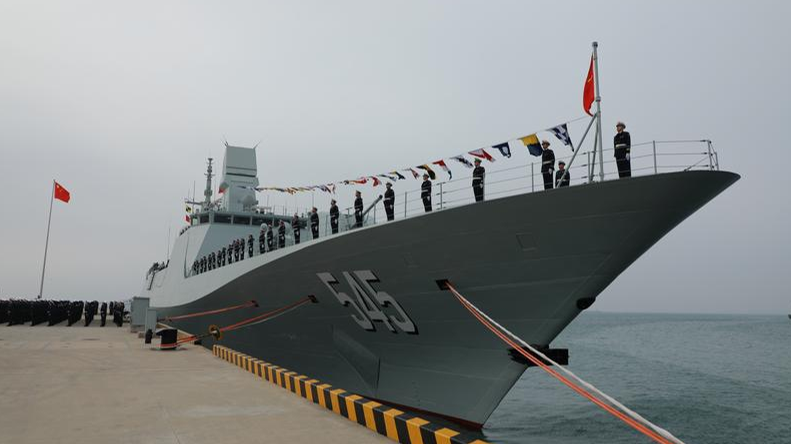 中国人民解放军海军054B护卫舰首舰漯河舰22日上午在青岛某军港交接入列。