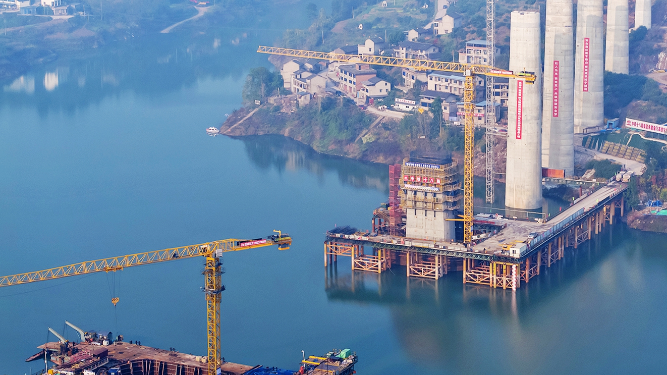 塔吊不停旋转、工人挥洒汗水……2025年1月1日,渝万高铁忠县段南溪村双线特大桥、㽏井河双线特大桥建设现场一派繁忙施工景象。