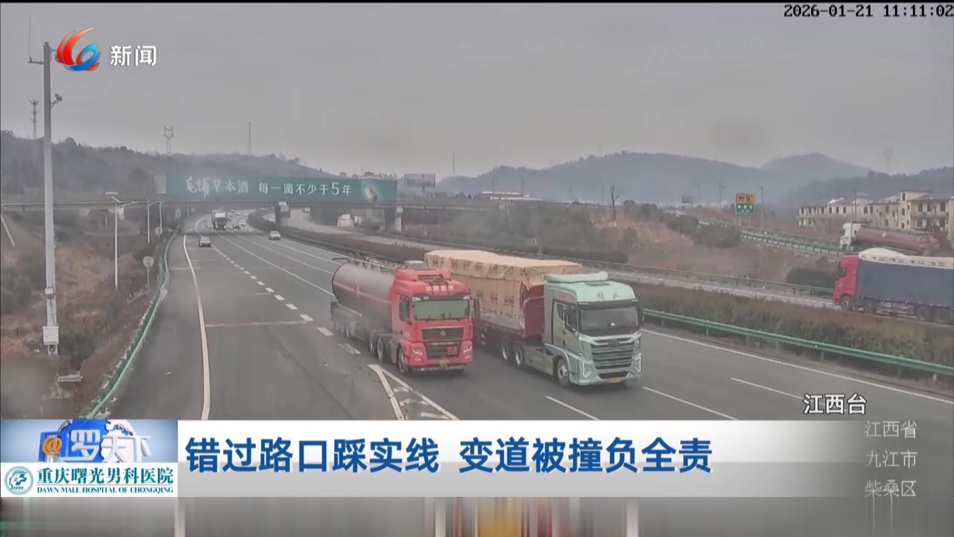 错过路口踩实线 变道被撞负全责
