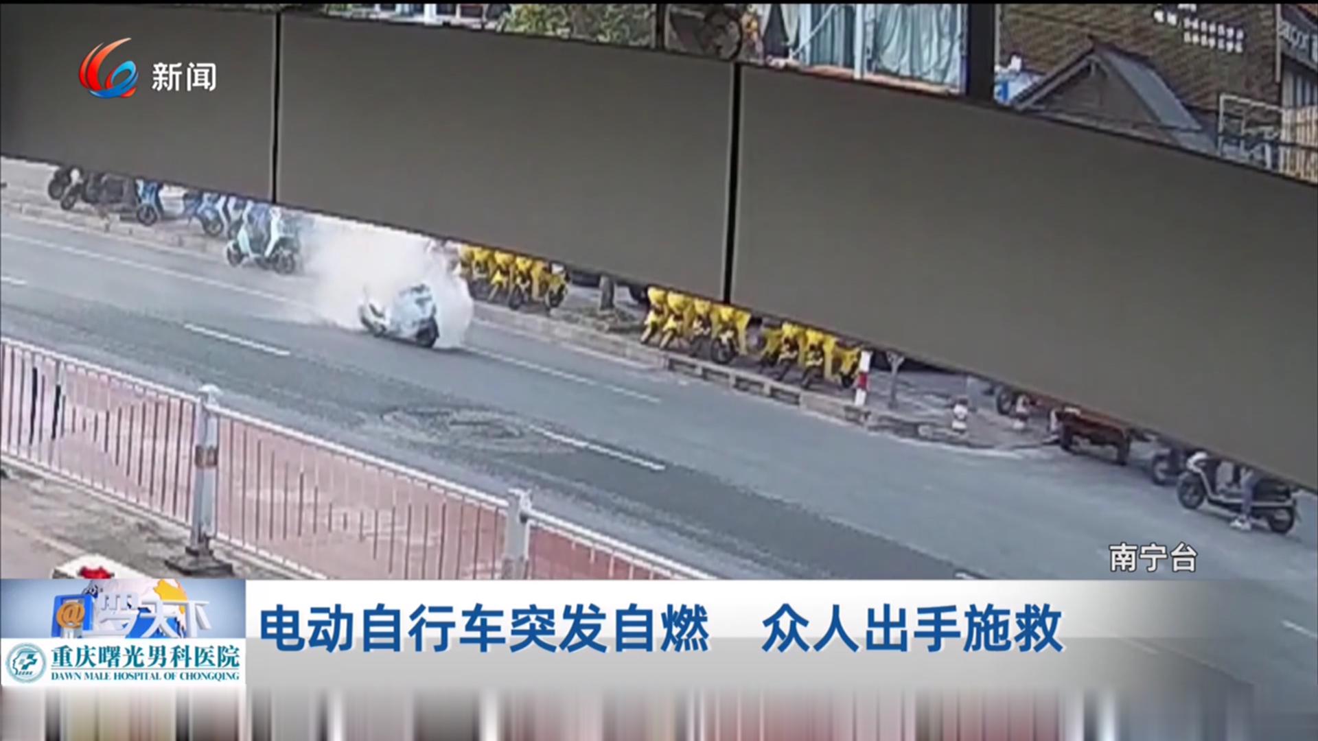 12月19号下午,在广西南宁市区,一辆行驶中的电动自行车突然冒烟并燃起大火,车主立即靠边停车处理。附近的公交站务员和商家也纷纷出手相助。