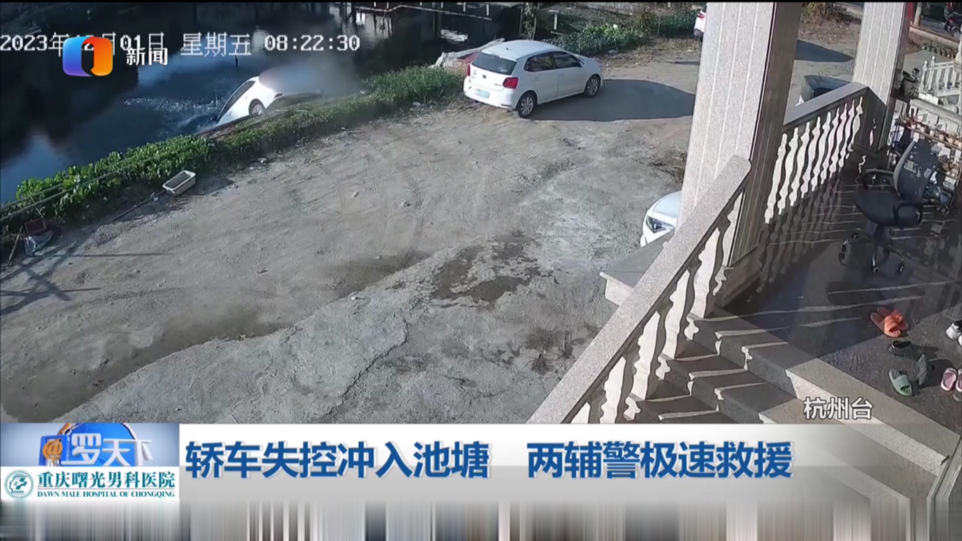 轿车失控冲入池塘 两辅警极速救援