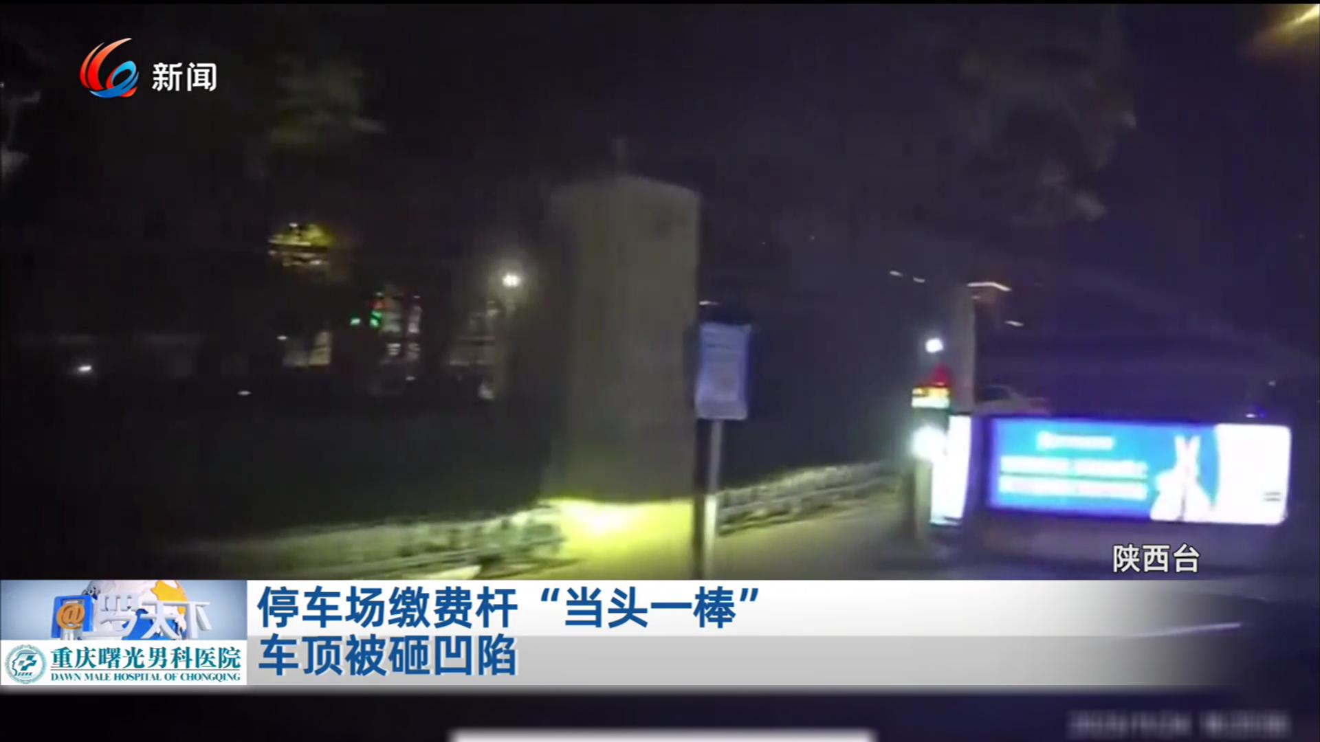 停车场缴费杆“当头一棒” 车顶被砸凹陷