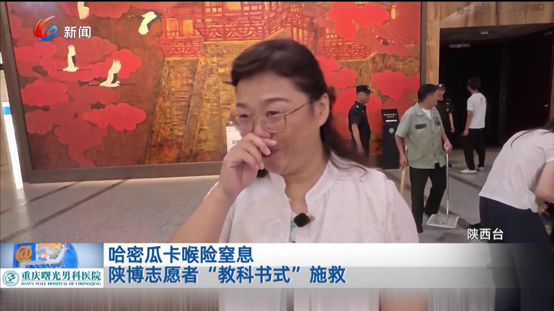 先来看一起紧急的救援。9月14日下午,在陕西历史博物馆内,胡女士在吃哈密瓜时,不慎卡喉引发窒息,幸好有志愿者朱倩文凭专业海姆立克急救法施救,众人联动,化解了危机。